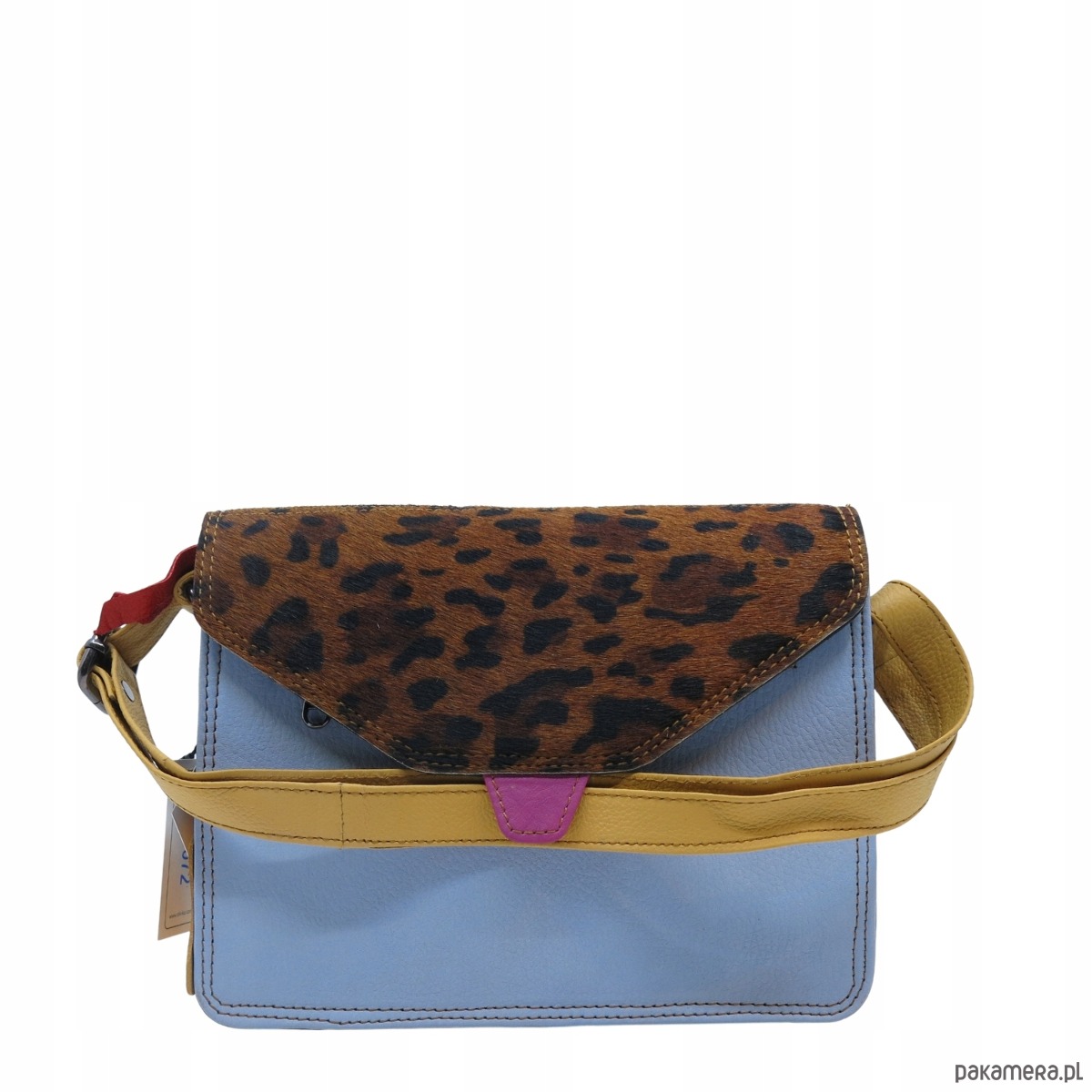 jedna strona klapki ze skóry licowej, druga ze skóry z naturalnym włosiem z nadrukiem