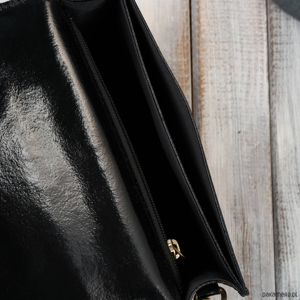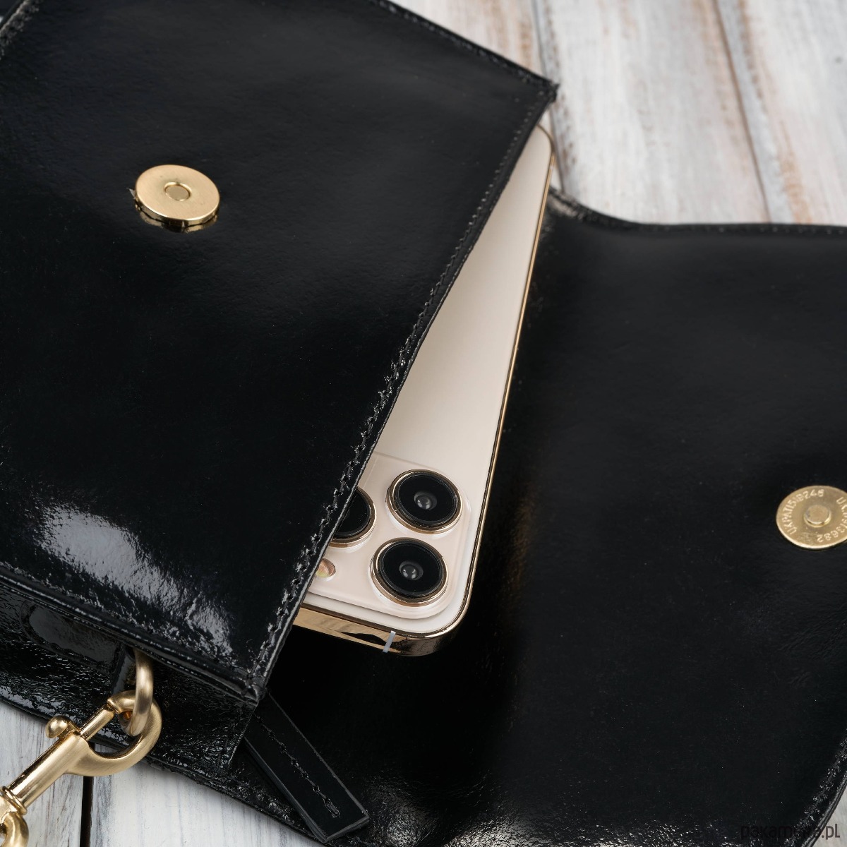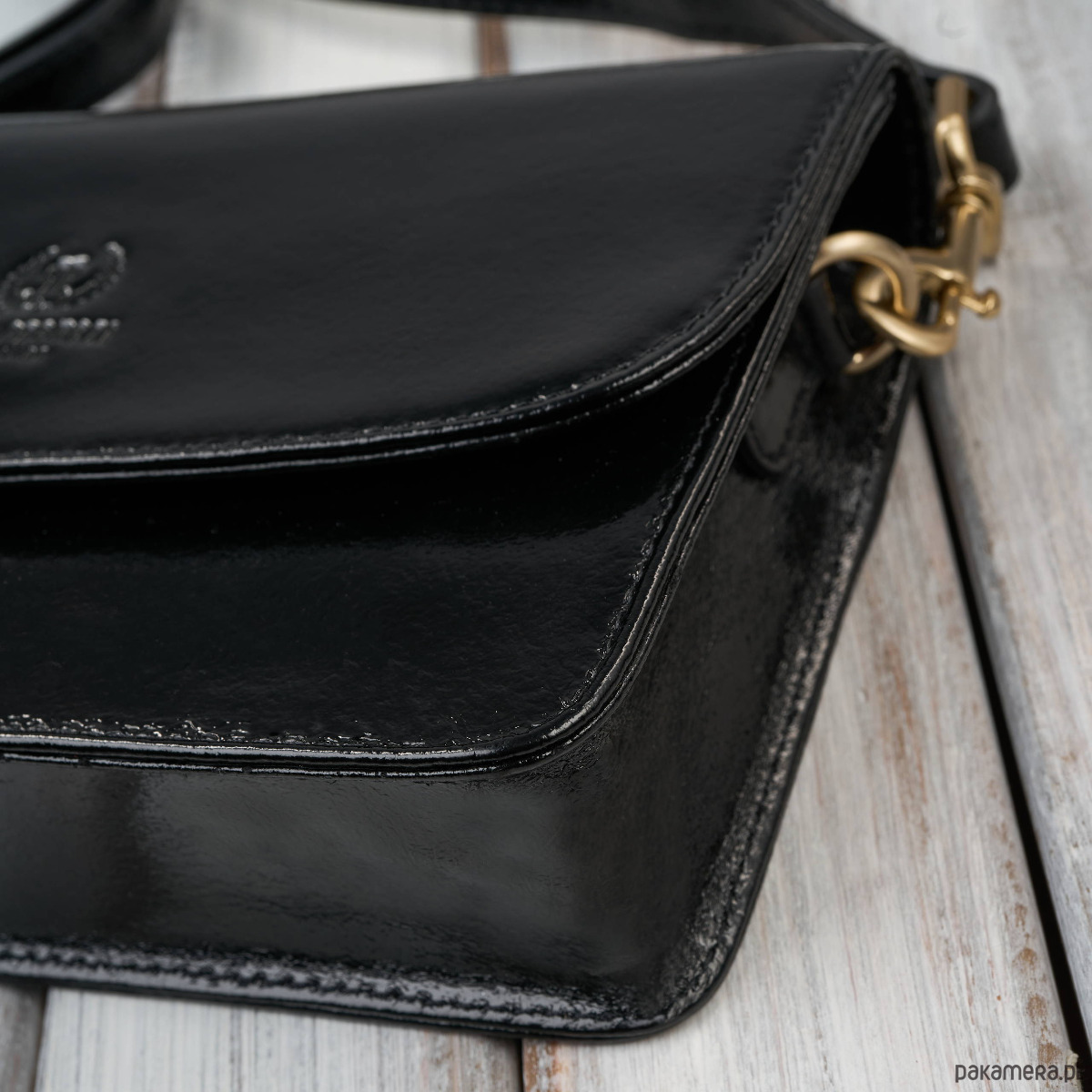 Złote okucia - dodają luksusowego charakteru i pięknie kontrastują z czernią lakierowanej skóry.