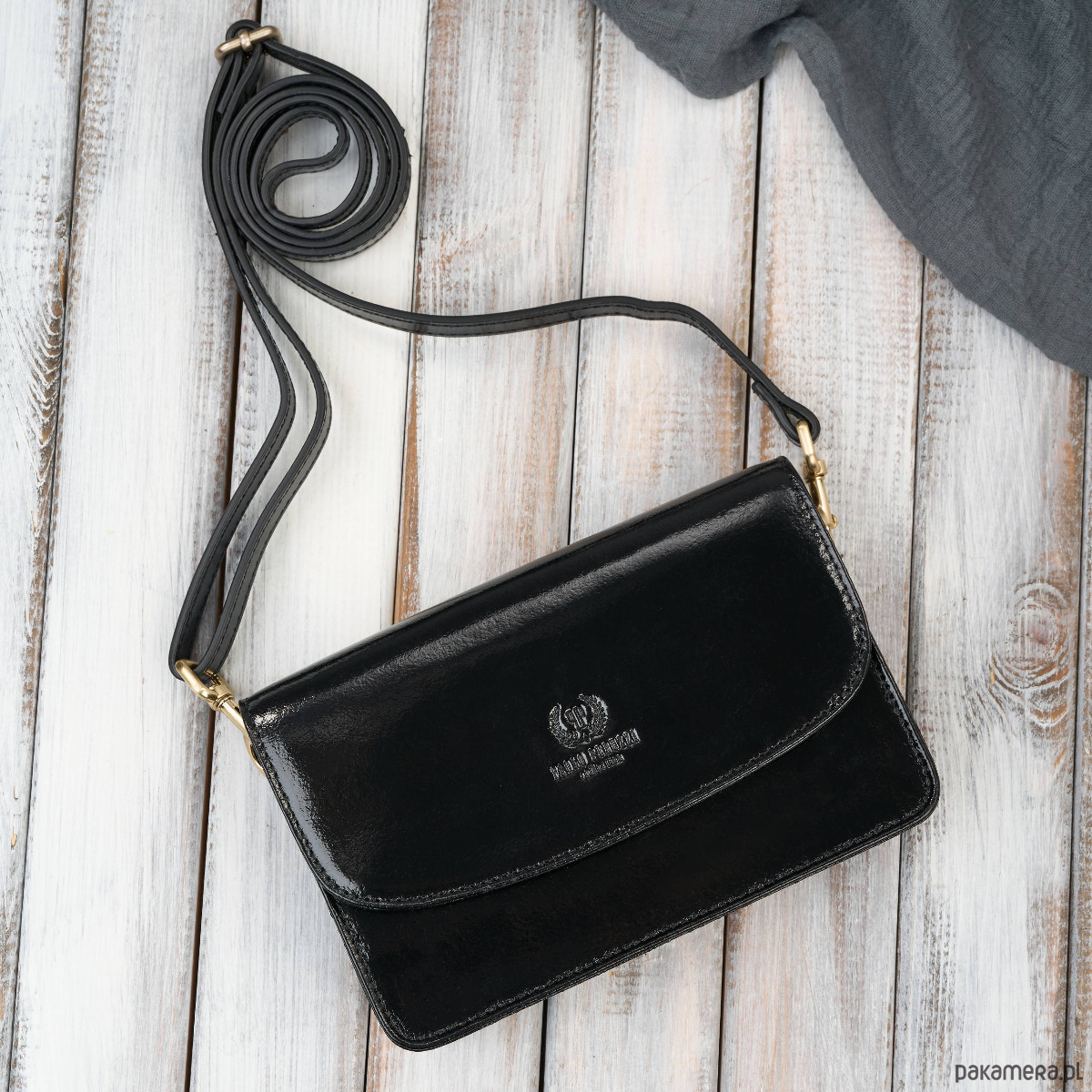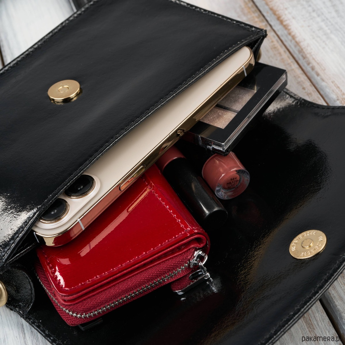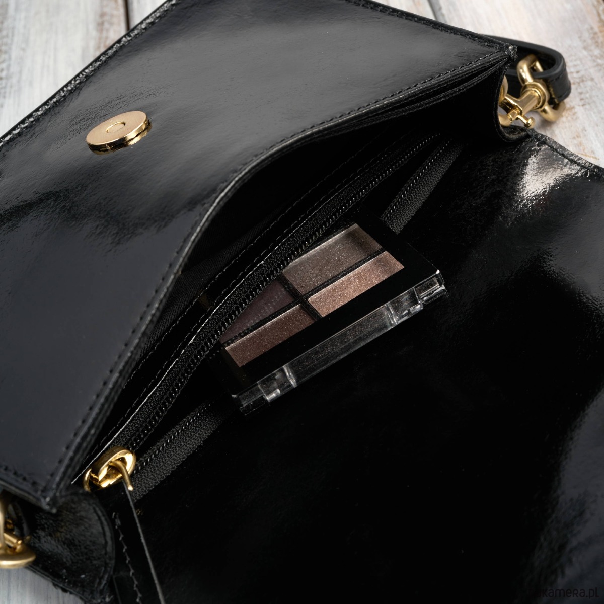 Złote okucia - dodają luksusowego charakteru i pięknie kontrastują z czernią lakierowanej skóry.