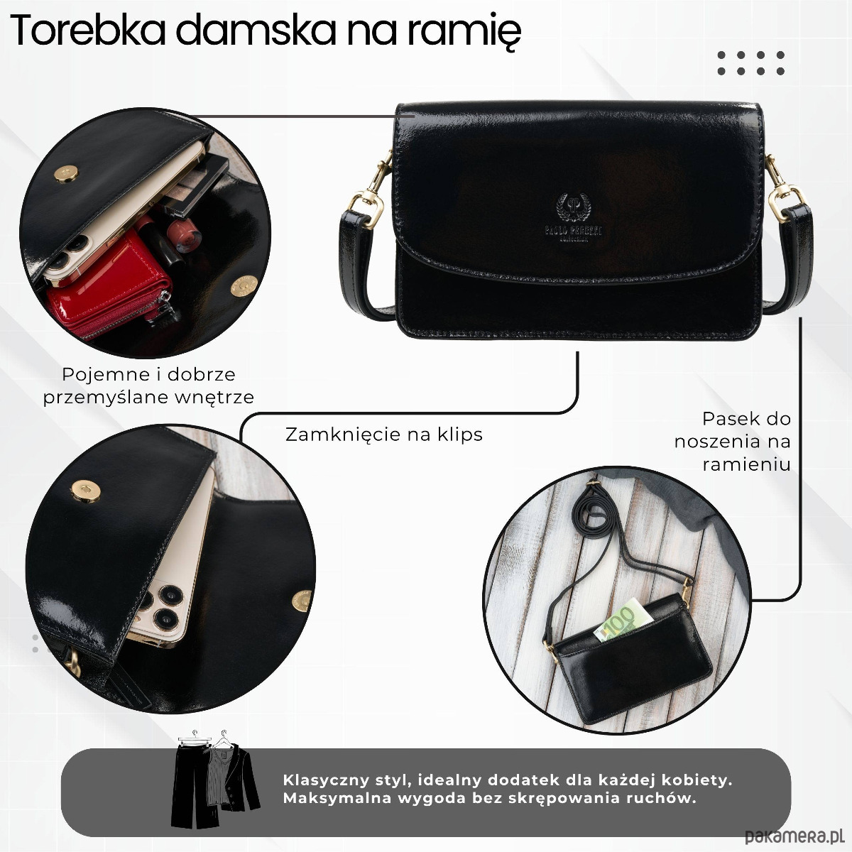 Odpinany pasek - możesz nosić ją na ramieniu lub w dłoni, dopasowując styl do okazji.
