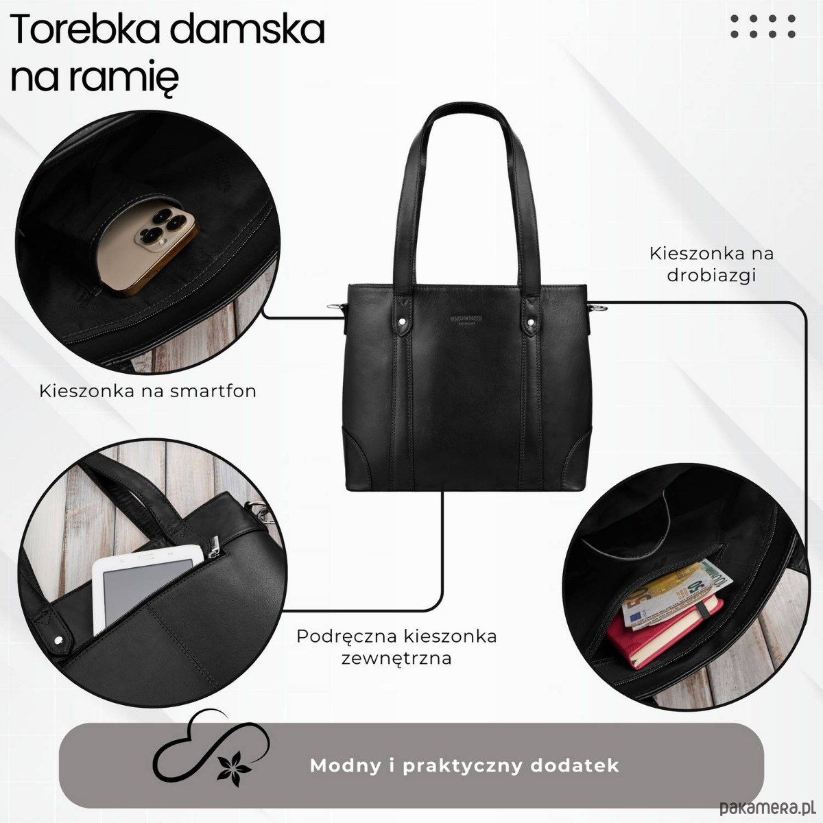 Torebka damska skórzana na ramię duża czarna torba damska shopper T-41-BL