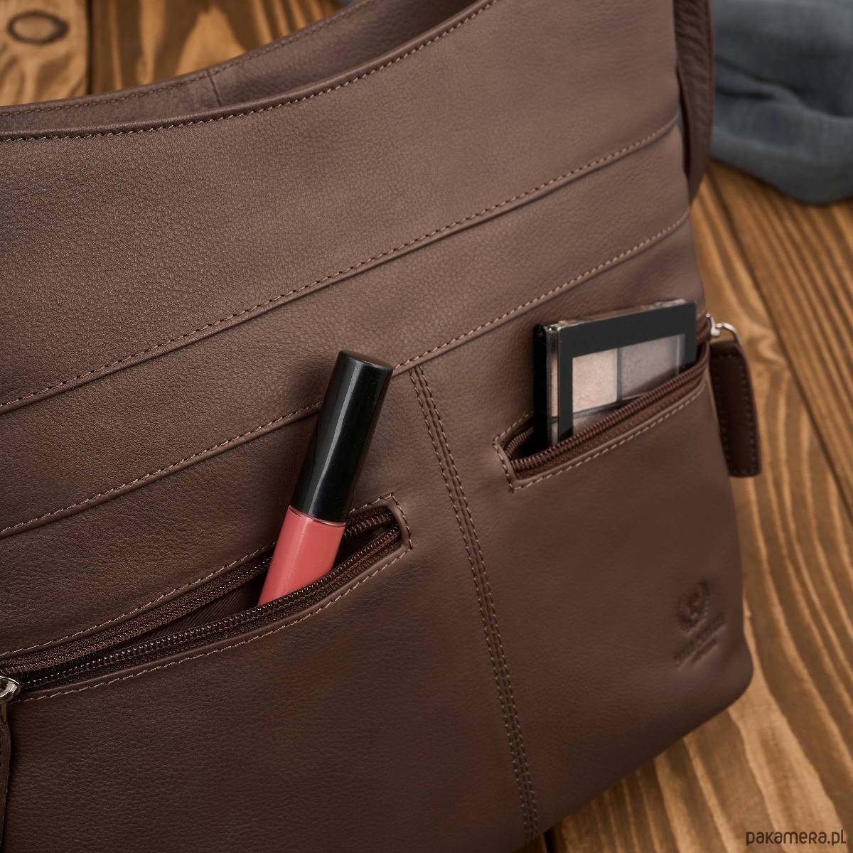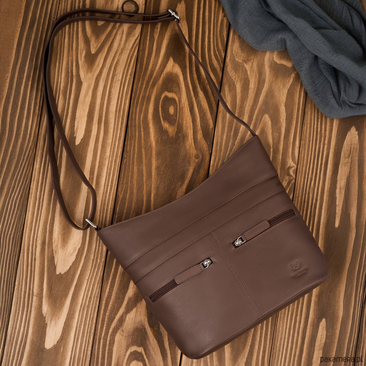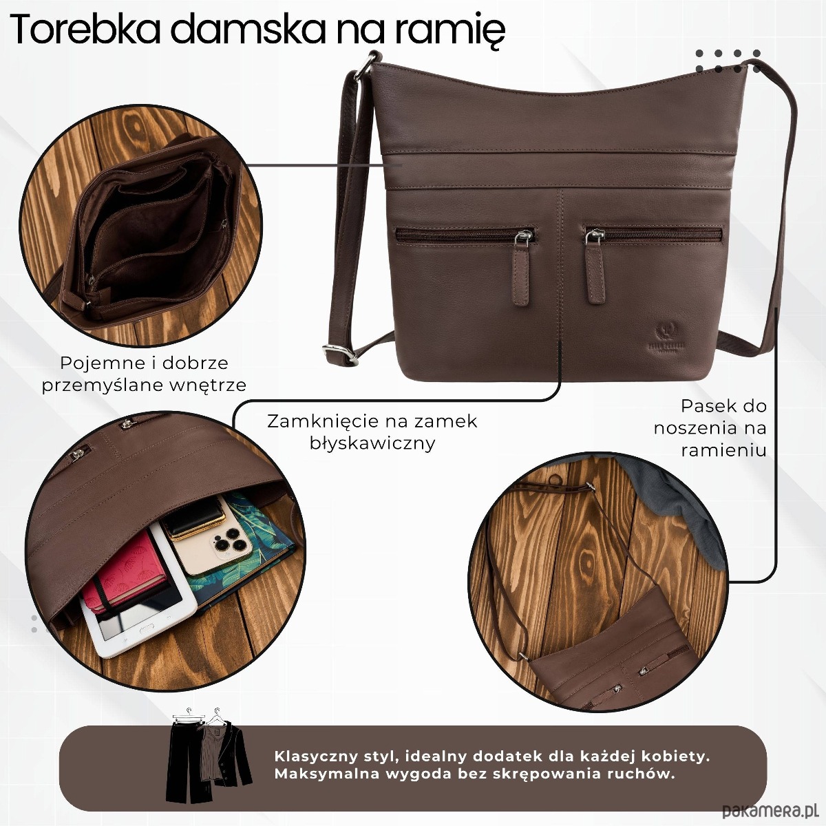 Wykonana z wysokiej jakości skóry naturalnej w uniwersalnym, brązowym kolorze, doskonale dopasowuje się do różnych stylizacji. Jedna pojemna komora główna została wyposażona w dwie przegrody, które ułatwiają organizację zawartości. Centralna przegroda to jednocześnie pojemna kieszeń zapinana na zamek, idealna na dokumenty, portfel czy inne wartościowe przedmioty.