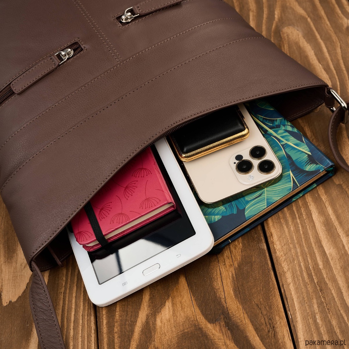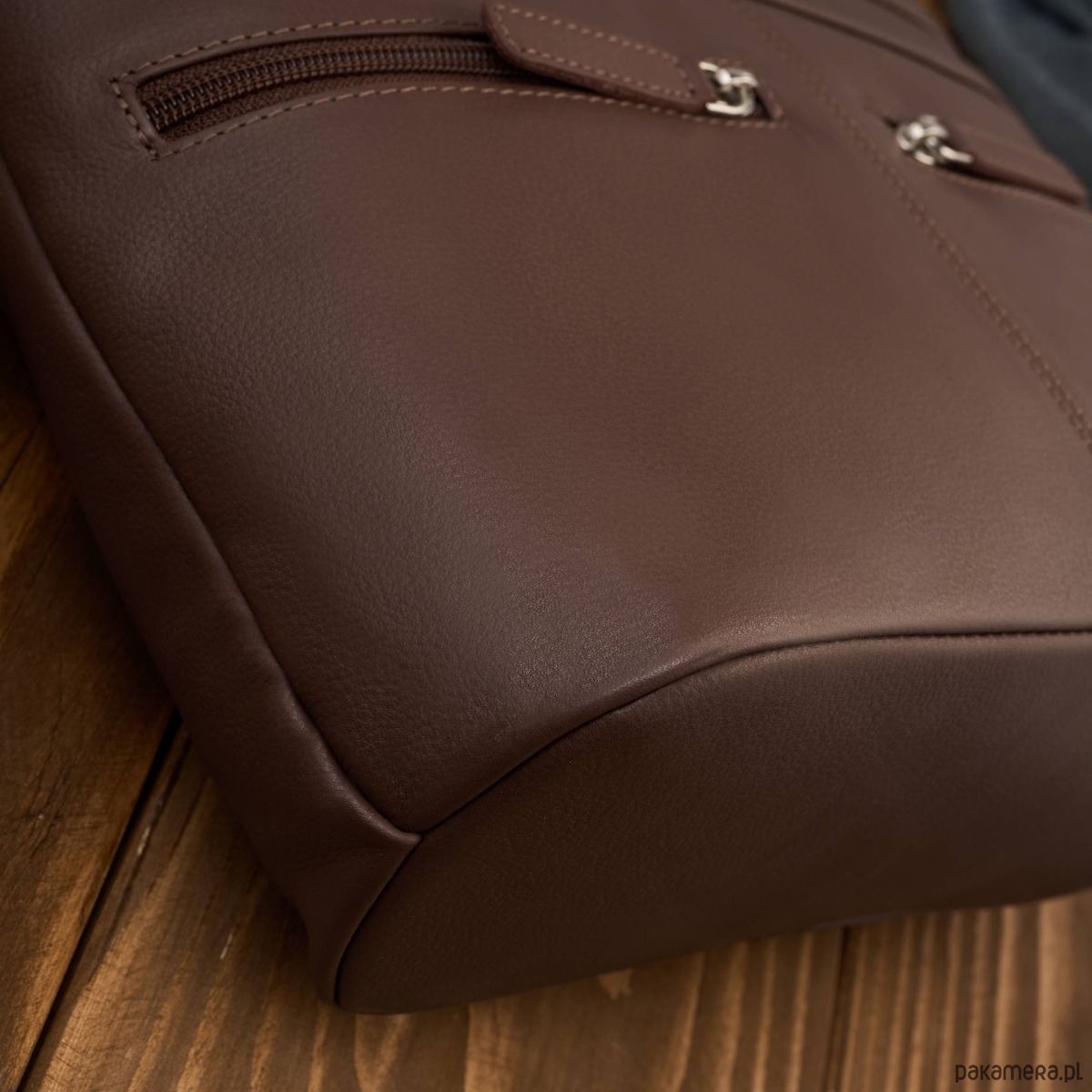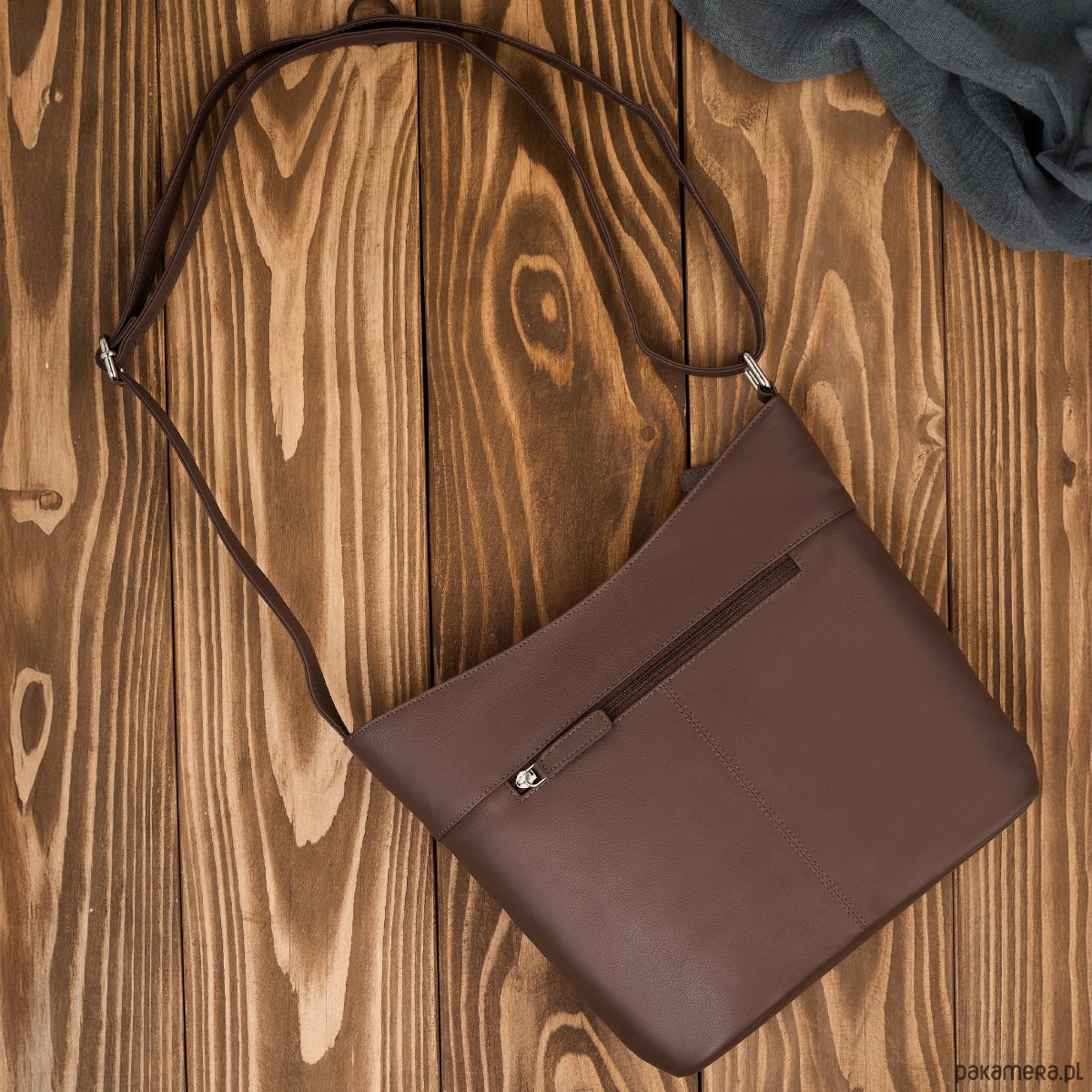 Wykonana z wysokiej jakości skóry naturalnej w uniwersalnym, brązowym kolorze, doskonale dopasowuje się do różnych stylizacji. Jedna pojemna komora główna została wyposażona w dwie przegrody, które ułatwiają organizację zawartości. Centralna przegroda to jednocześnie pojemna kieszeń zapinana na zamek, idealna na dokumenty, portfel czy inne wartościowe przedmioty.