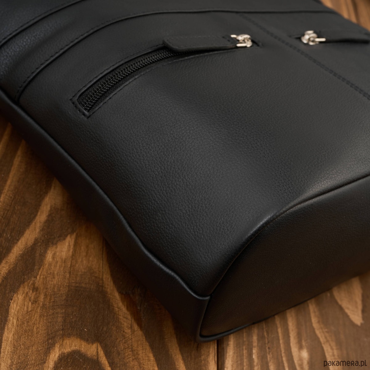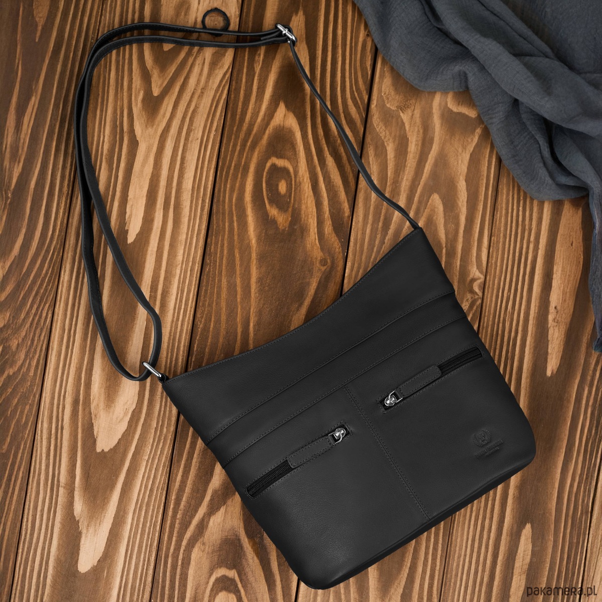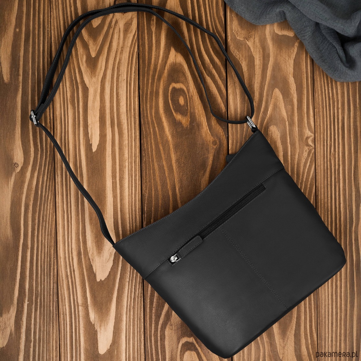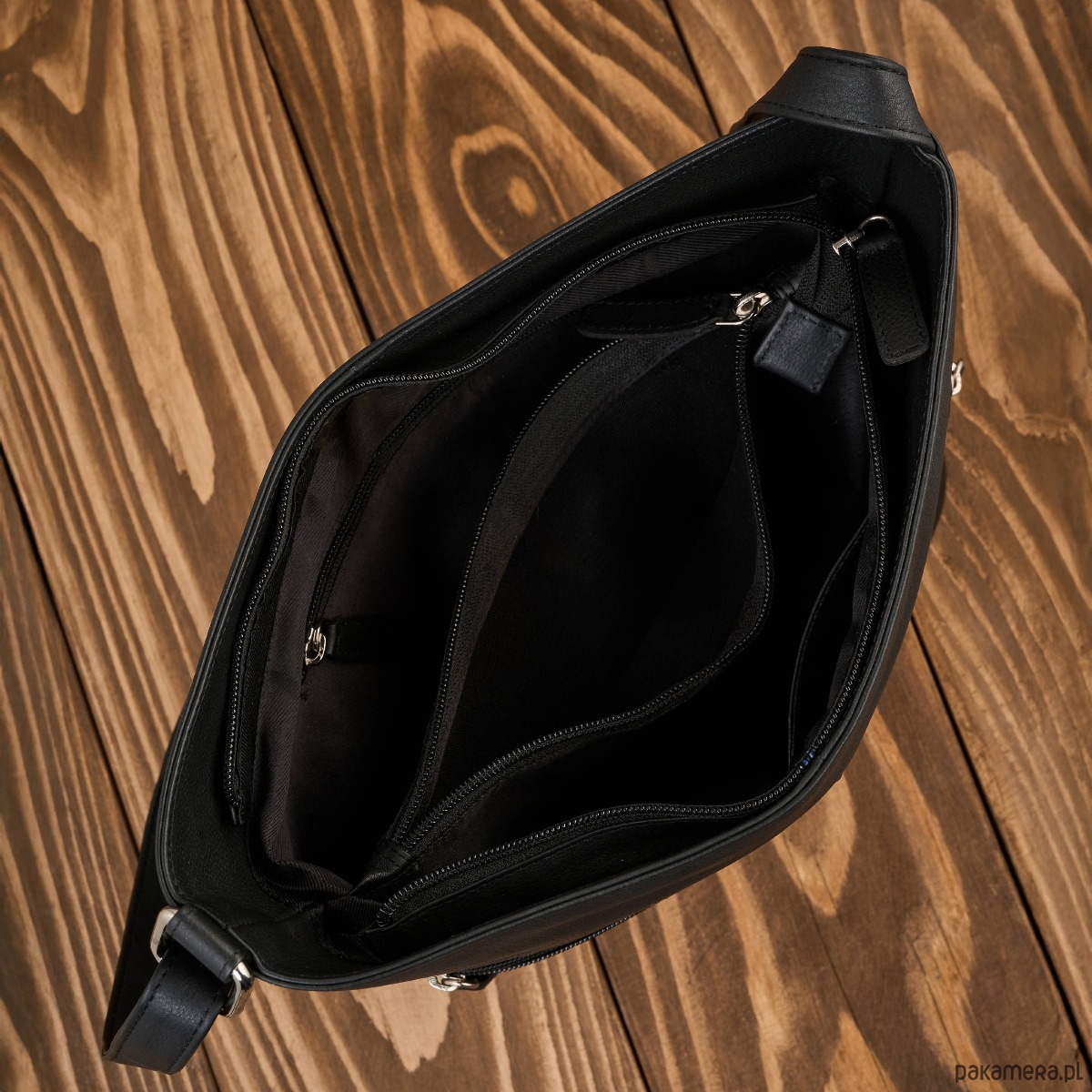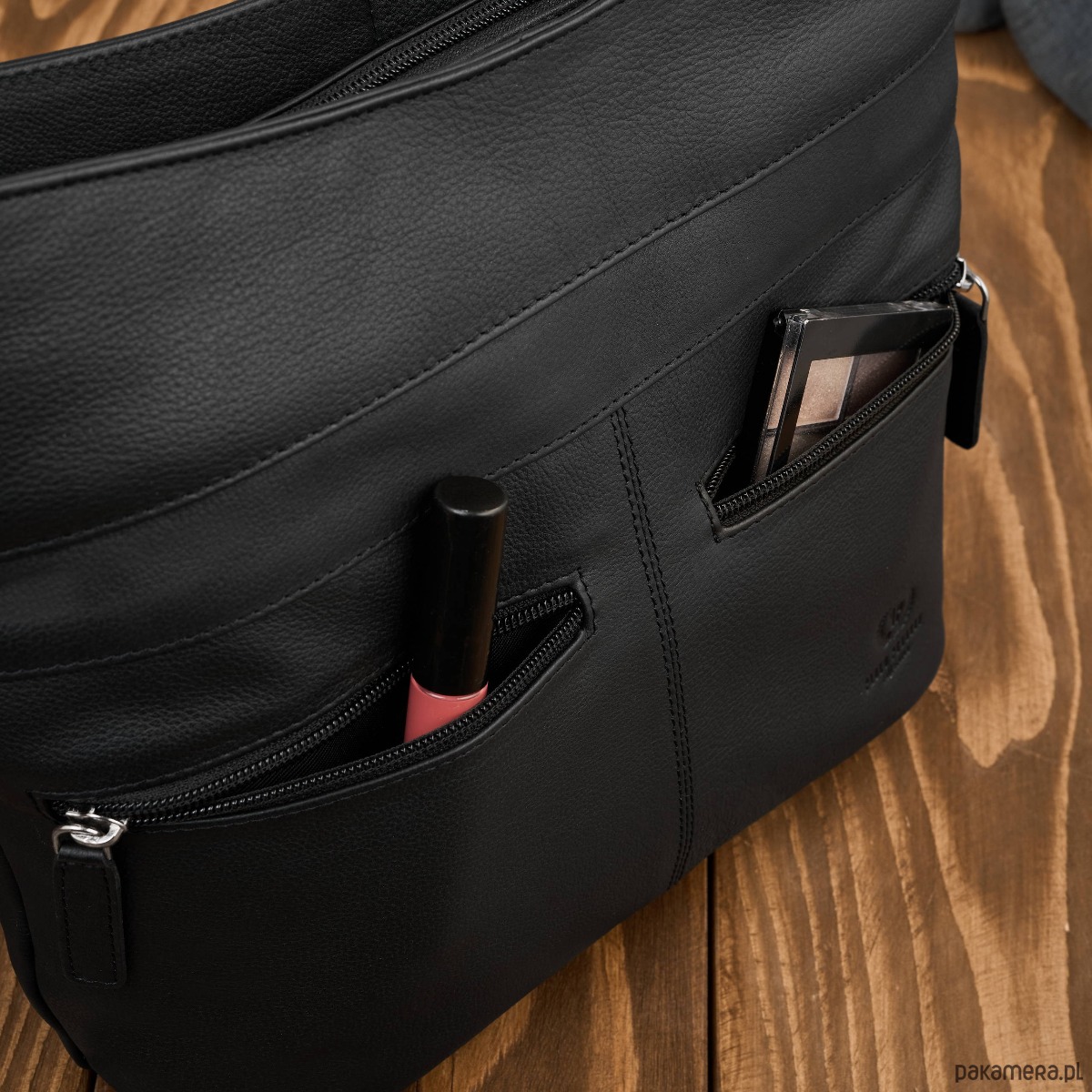 Wykonana z wysokiej jakości skóry naturalnej w uniwersalnym, czarnym kolorze, doskonale dopasowuje się do różnych stylizacji. Jedna pojemna komora główna została wyposażona w dwie przegrody, które ułatwiają organizację zawartości. Centralna przegroda to jednocześnie pojemna kieszeń zapinana na zamek, idealna na dokumenty, portfel czy inne wartościowe przedmioty.