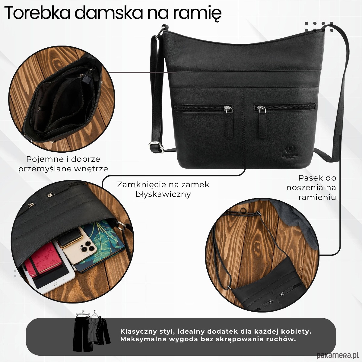Klasyczny kolor sprawia, że to jedna z najbardziej uniwersalnych torebek damskich skórzanych w garderobie.