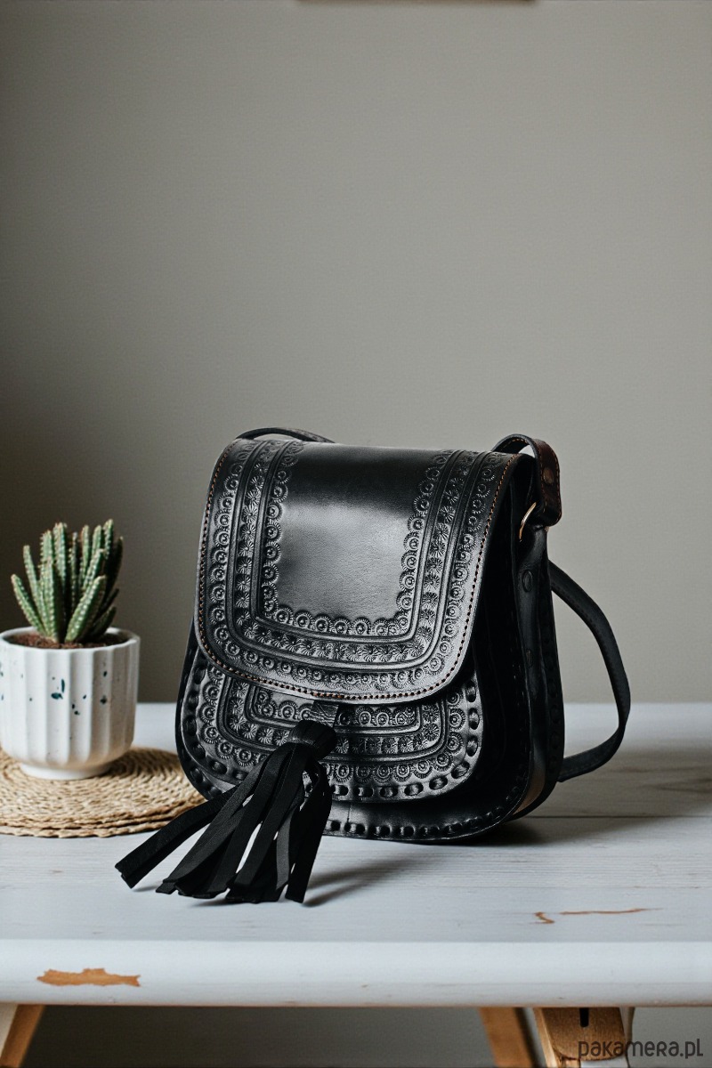 Mała czarna torebka z frędzlami wykonana ręcznie z grubej, juchtowej skóry to niezwykle stylowy dodatek do każdej eleganckiej garderoby. Jej klasyczny kształt i staranne wykonanie sprawiają, że jest to unikatowy element, który przyciąga uwagę swoją wyjątkową formą. Frędzle nadają torebce niepowtarzalny charakter, dodając subtelny element ruchu i dynamizmu. Gruba skóra juchtowa zapewnia trwałość i solidność, co sprawia, że torebka jest nie tylko piękna, ale także praktyczna i trwała. To doskonały wybór dla osób ceniących wysoką jakość wykonania i unikalny design, które chcą dodać swojej stylizacji wyrafinowanego i oryginalnego akcentu.