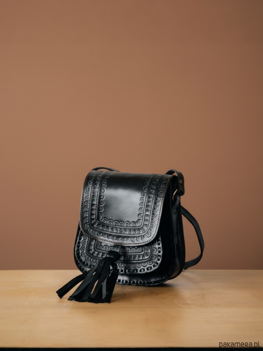 Mała czarna torebka z frędzlami wykonana ręcznie z grubej, juchtowej skóry to niezwykle stylowy dodatek do każdej eleganckiej garderoby. Jej klasyczny kształt i staranne wykonanie sprawiają, że jest to unikatowy element, który przyciąga uwagę swoją wyjątkową formą. Frędzle nadają torebce niepowtarzalny charakter, dodając subtelny element ruchu i dynamizmu. Gruba skóra juchtowa zapewnia trwałość i solidność, co sprawia, że torebka jest nie tylko piękna, ale także praktyczna i trwała. To doskonały wybór dla osób ceniących wysoką jakość wykonania i unikalny design, które chcą dodać swojej stylizacji wyrafinowanego i oryginalnego akcentu.