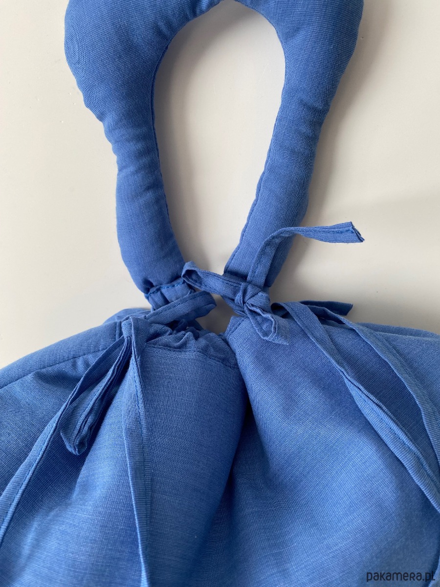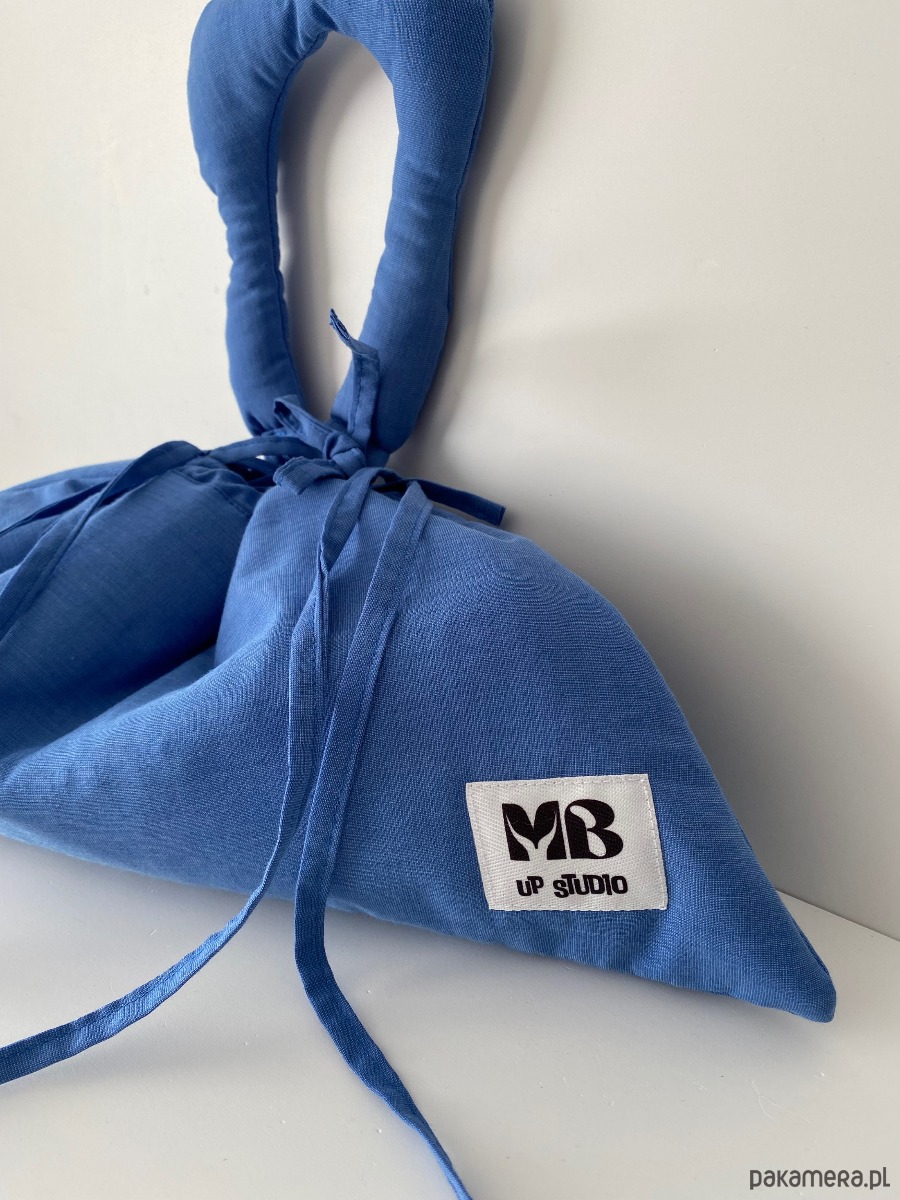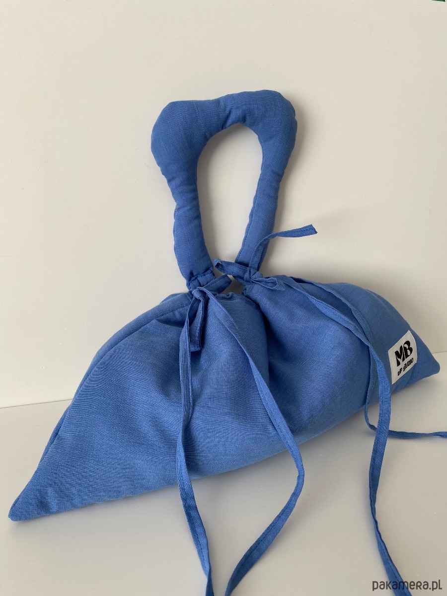 Torebka handmade w kształcie trójkąta z miękką rączką, zapinaną na wiązanie.