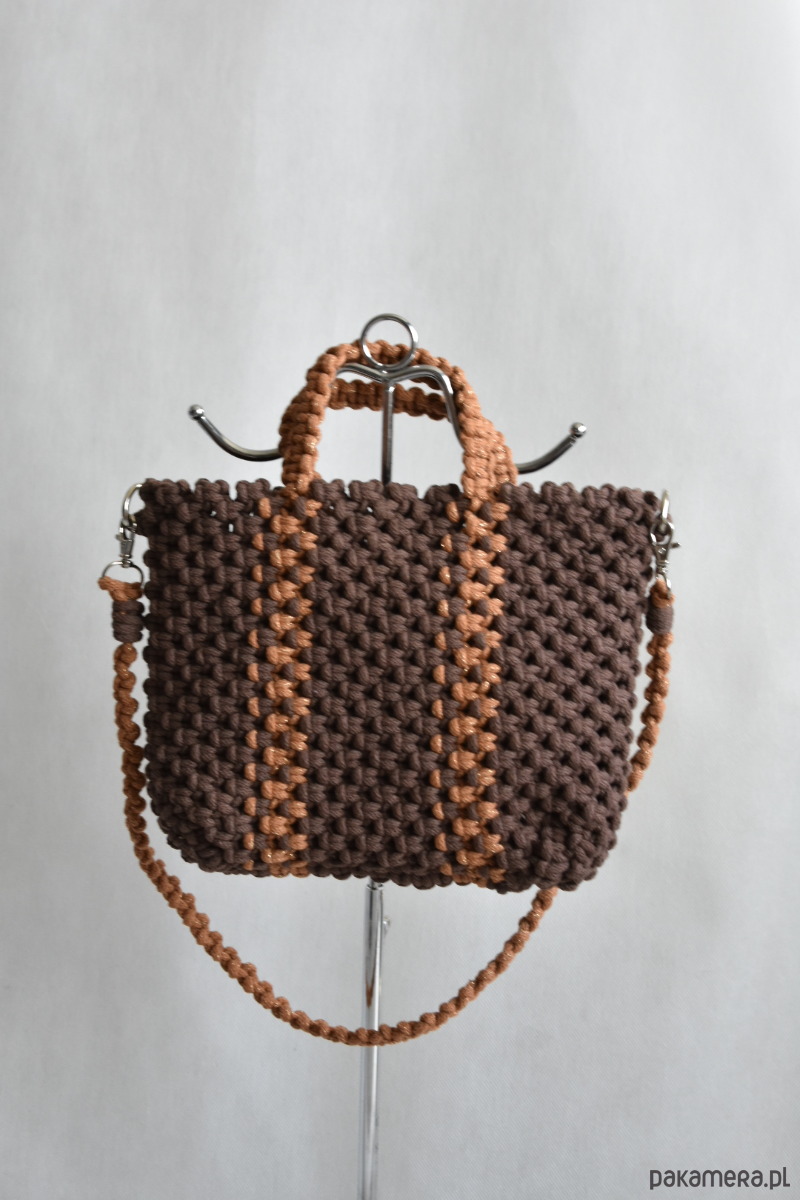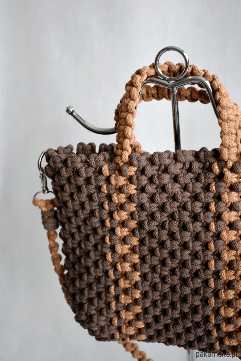 Torebka wykonana techniką makramy ze sznurka 5 mm w kolorze brązowym i jasnym brązowym ze złotą nitką.