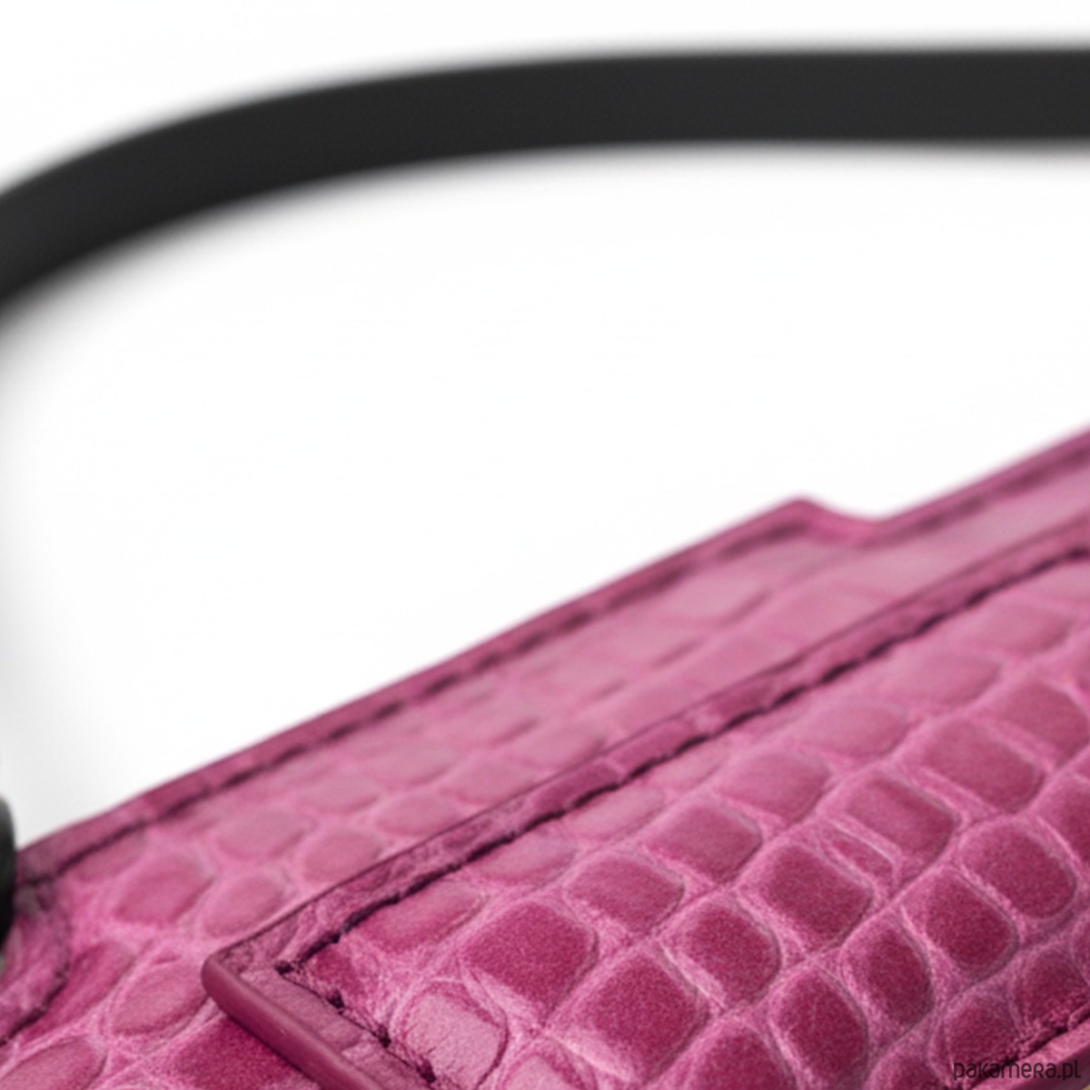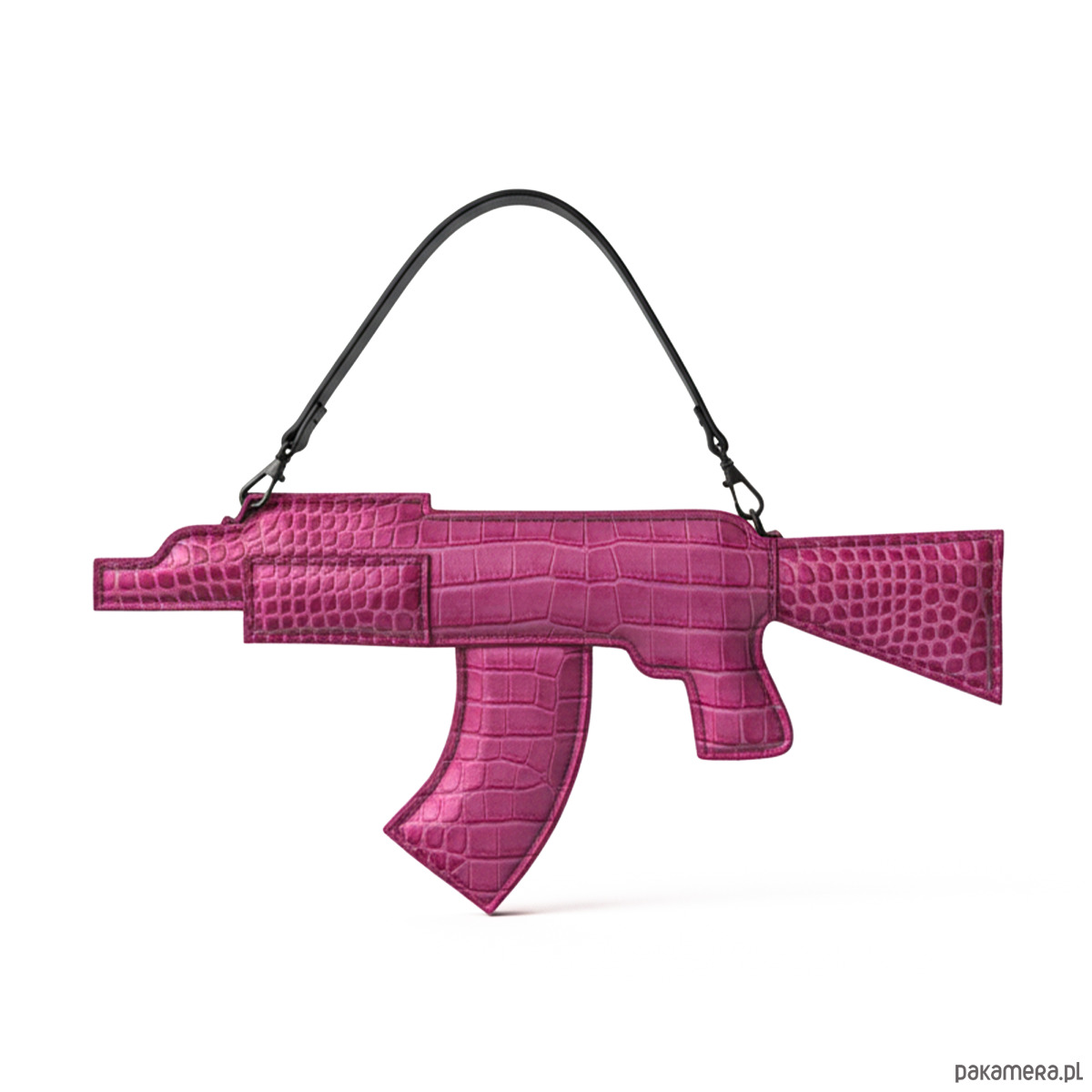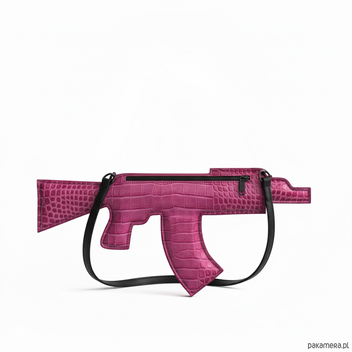 Torebka „Fashion Killa” to ręcznie wykonany model z naturalnej, tłoczonej skóry o wysokiej jakości i wyjątkowej trwałości. Jej charakterystyczny kształt inspirowany stylizowanym karabinem nadaje projektowi nowoczesny, wyrazisty charakter. Model utrzymany w żywym różowym kolorze posiada zapięcie na zamek błyskawiczny z tyłu oraz jedną główną przegrodę, idealną na niezbędne drobiazgi. Odpinany, regulowany pasek wykonany ze skóry pozwala nosić torbę zarówno na ramieniu, jak i w formie kopertówki. Metalowe elementy w kolorze srebrnym podkreślają luksusowy charakter całości. Przy szerokości około 55 cm torba łączy oryginalny design z praktycznym wymiarem, stanowiąc unikalne połączenie funkcjonalności i artystycznego rzemiosła.