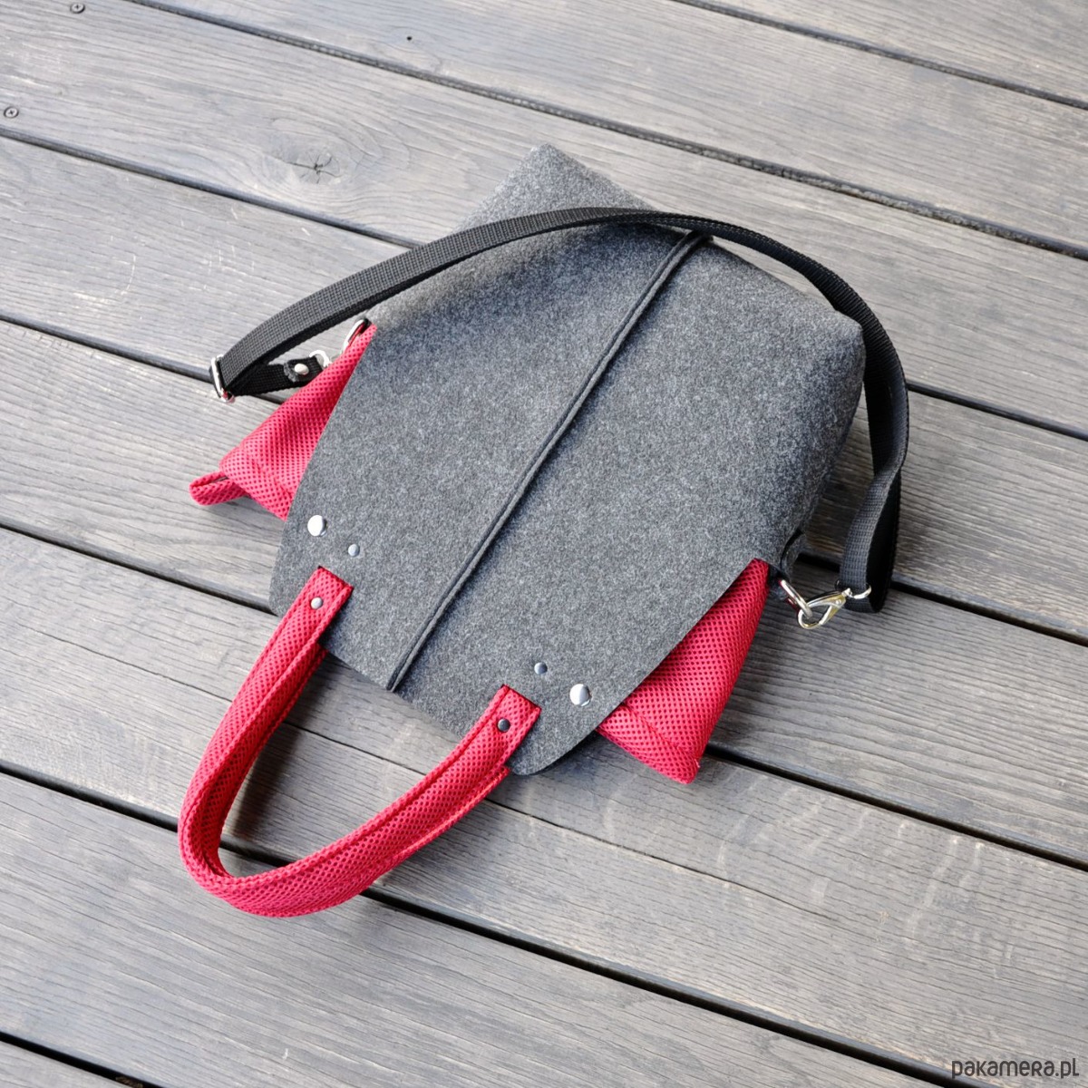 Nowoczesna, trwała i wygodna torebka filcowa. Najwygodniej nosić ją w ręce lub jako listonoszkę - na skos. Uszyta z filcu 100% poliestrowego. Wewnątrz torebki dopasowany do wnętrza organizer z czerwonej siatki dystansowej. W nim kieszonki na akcesoria. Organizer zamykany na zamek. Rączki uszyte również z siatki, ale dodatkowo wzmocnione wewnątrz. Torebka ta nie będzie się mechacić ponieważ jest uszyta stroną impregnowaną na zewnątrz.