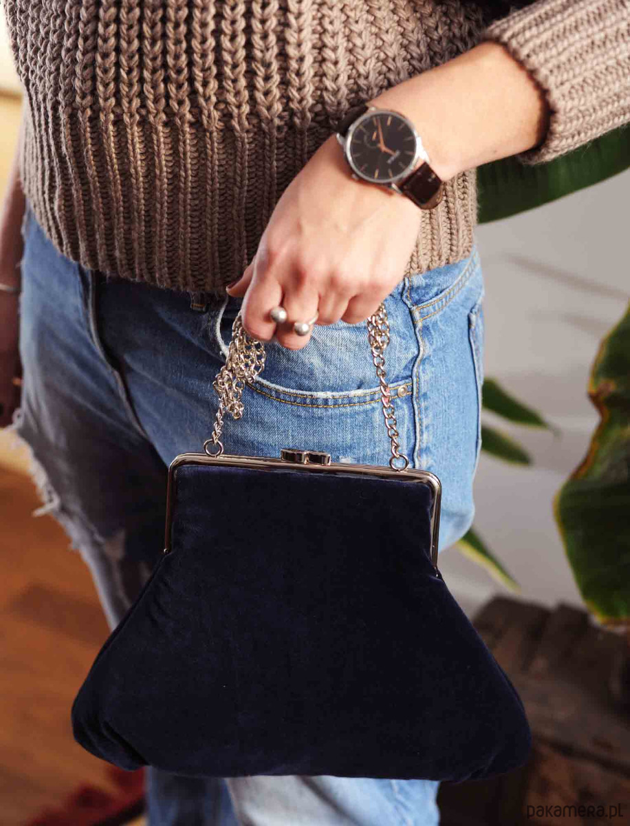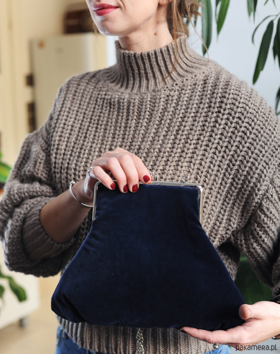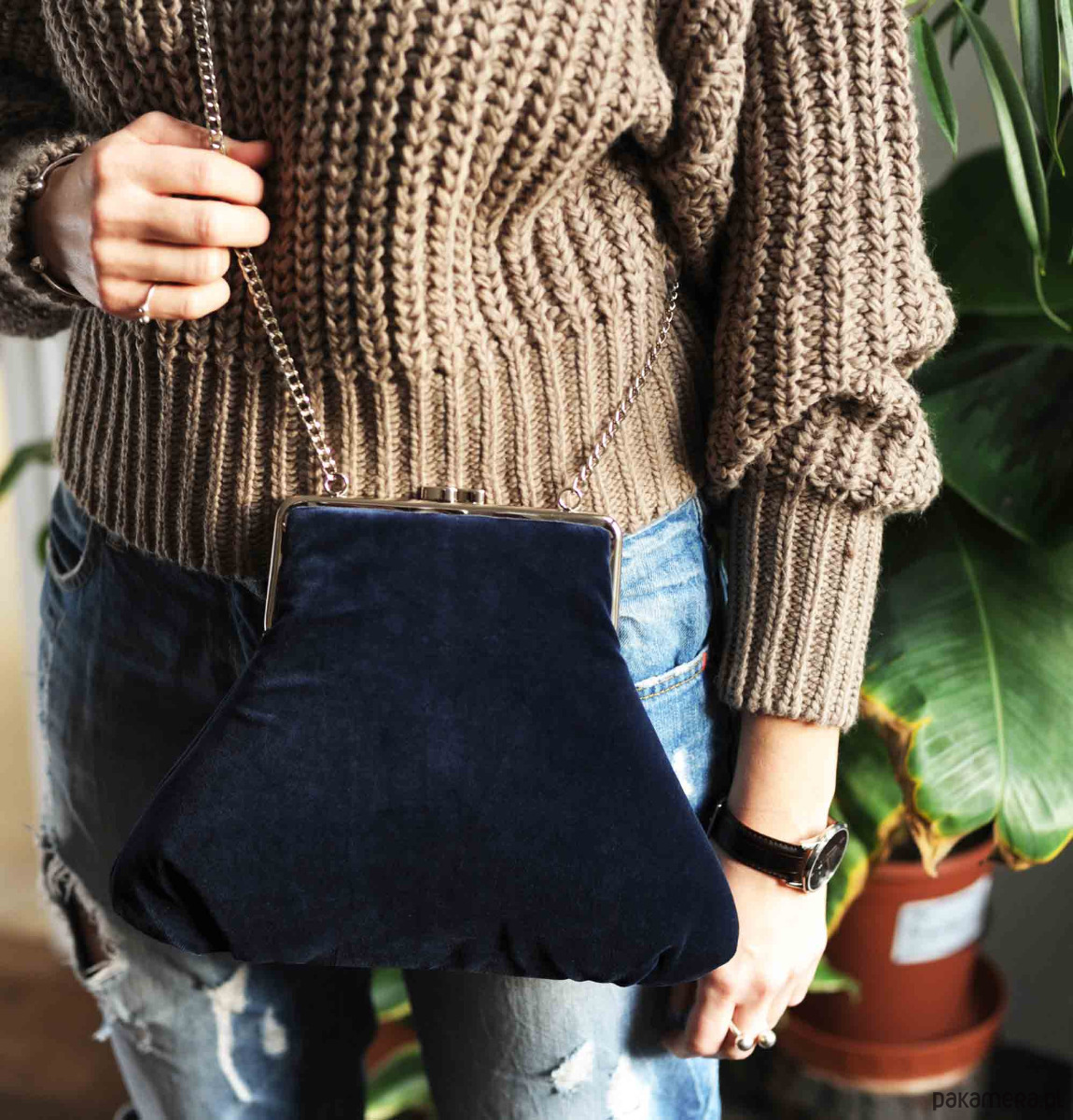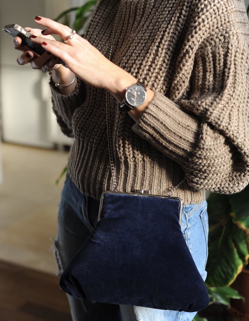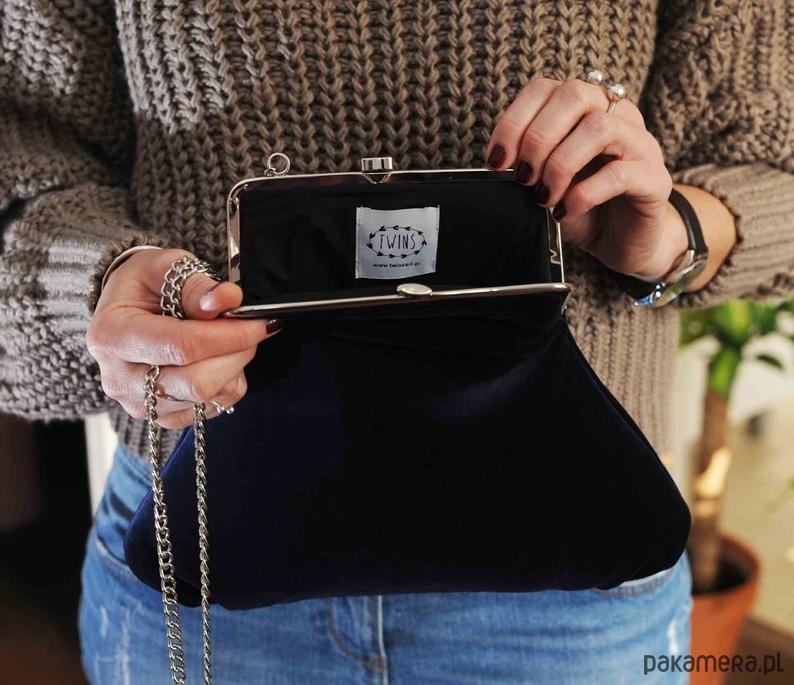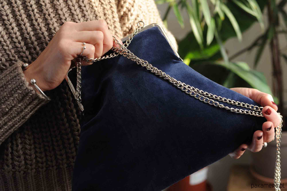 Mała, elegancka torebka zapinana na metalowe, srebrne zapięcie. Wykonana z niebieskiej, granatowej tkaniny,(aksamit). W środku podszewka(prosze pytać o kolor).Rączka to łańcuszek do zakładania przez głowę. Torebka jest usztywniana i marszczona przez co bardzo pakowna. Wymiary: 24(długość)x24(szerokość)x8(bok); szerokość zapięcia 16cm