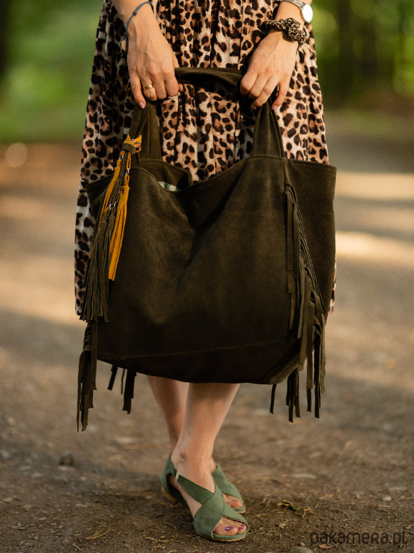 Torebka hobo z frędzlami typu hobo. Bardzo wygodny i praktyczny worek, który pomieści wszystkie potrzebne i niepotrzebne rzeczy. Wykonana ze skóry naturalnej (zamsz) w kolorze khaki wykończona tak modnymi w tym sezonie frędzlami. Zapinana na magnes. Podszewka bawełniana w piękne kwiaty dopasowana do torebki, tworzy idealne zestawienie kolorystyczne. W środku kieszonka na zamek oraz dwie kieszenie na drobiazgi. Torebka fajnie dopasowuje się do ciała. Dzięki krótkim rączką idealnie leży na ramieniu, a dodatkowy pasek sprawdzi się przy noszeniu torebki na ukos.
