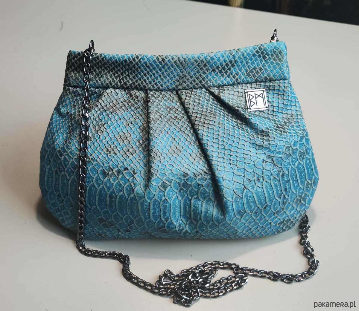 Torebka na ramię i do ręki, zamykana na suwak. Posiada odpinany łańcuszek. Wewnątrz mała, zamykana kieszonka.