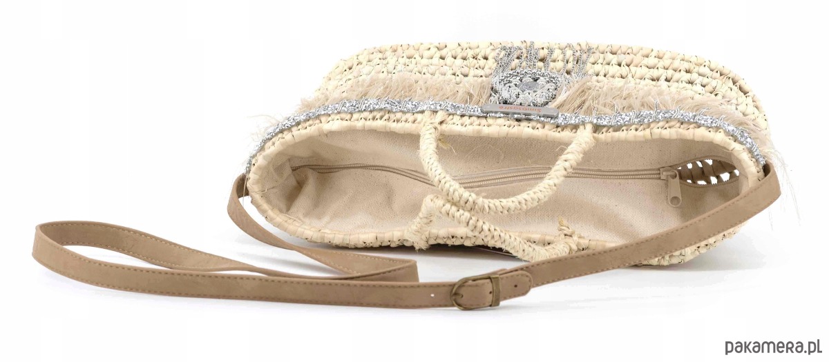 -bogato zdobiony przód torebki: frędzlami z efektem piór i ozdobną lamówką