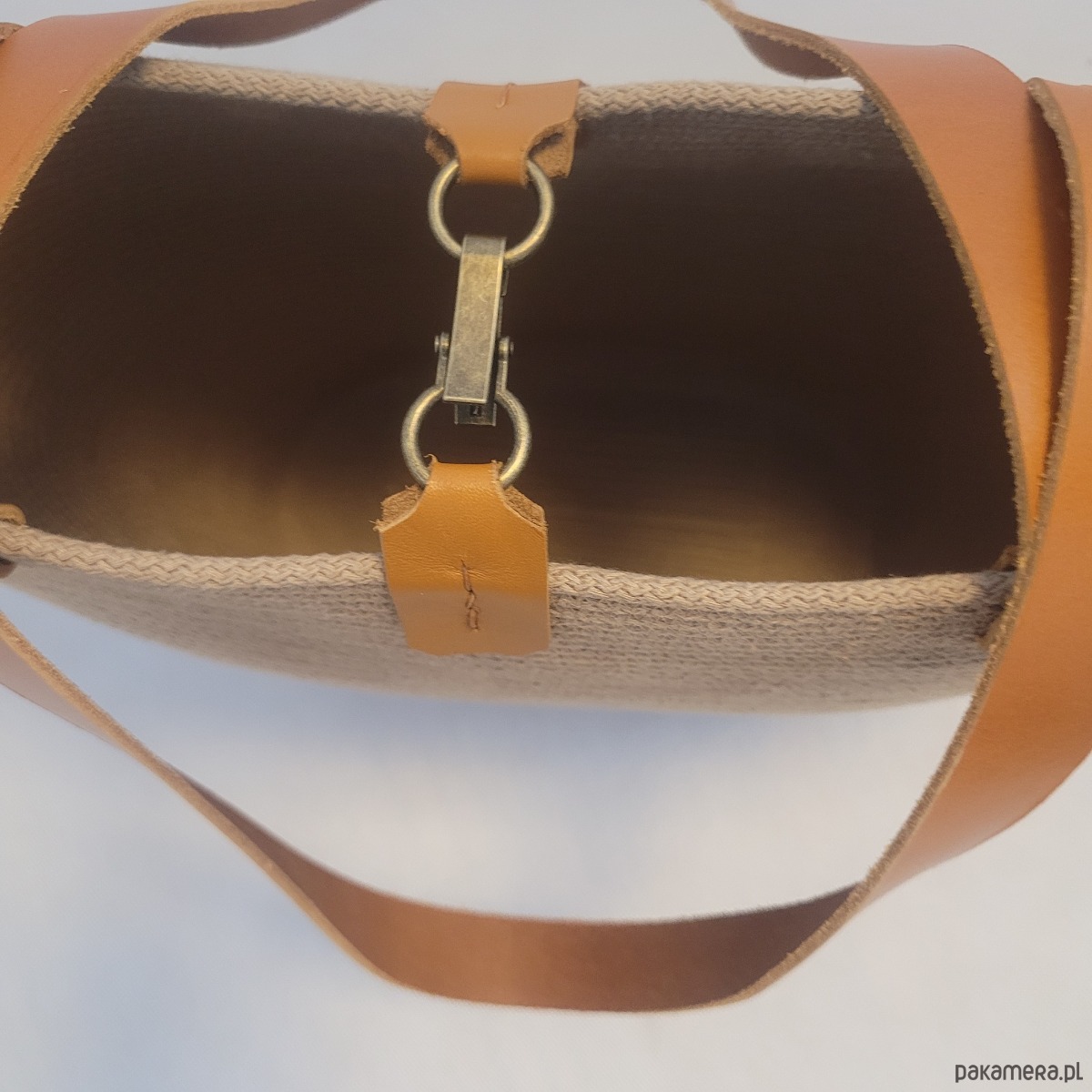 Torebka koszyk, szyta ręcznie ze sztywnego sznurka bawełnianego o grubości 5mm. Idealny wybór do letniej stylizacji, będzie funkcjonalnym i pięknym dodatkiem. Kosz posiada wygodne rączki, jest lekki I pojemny. Ma wszyte małe zapiecie w kolorze rączek.
