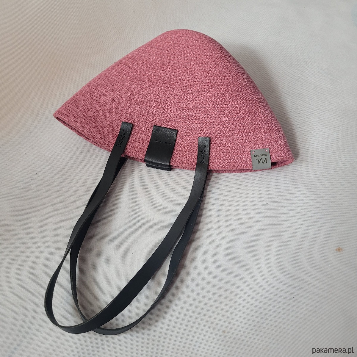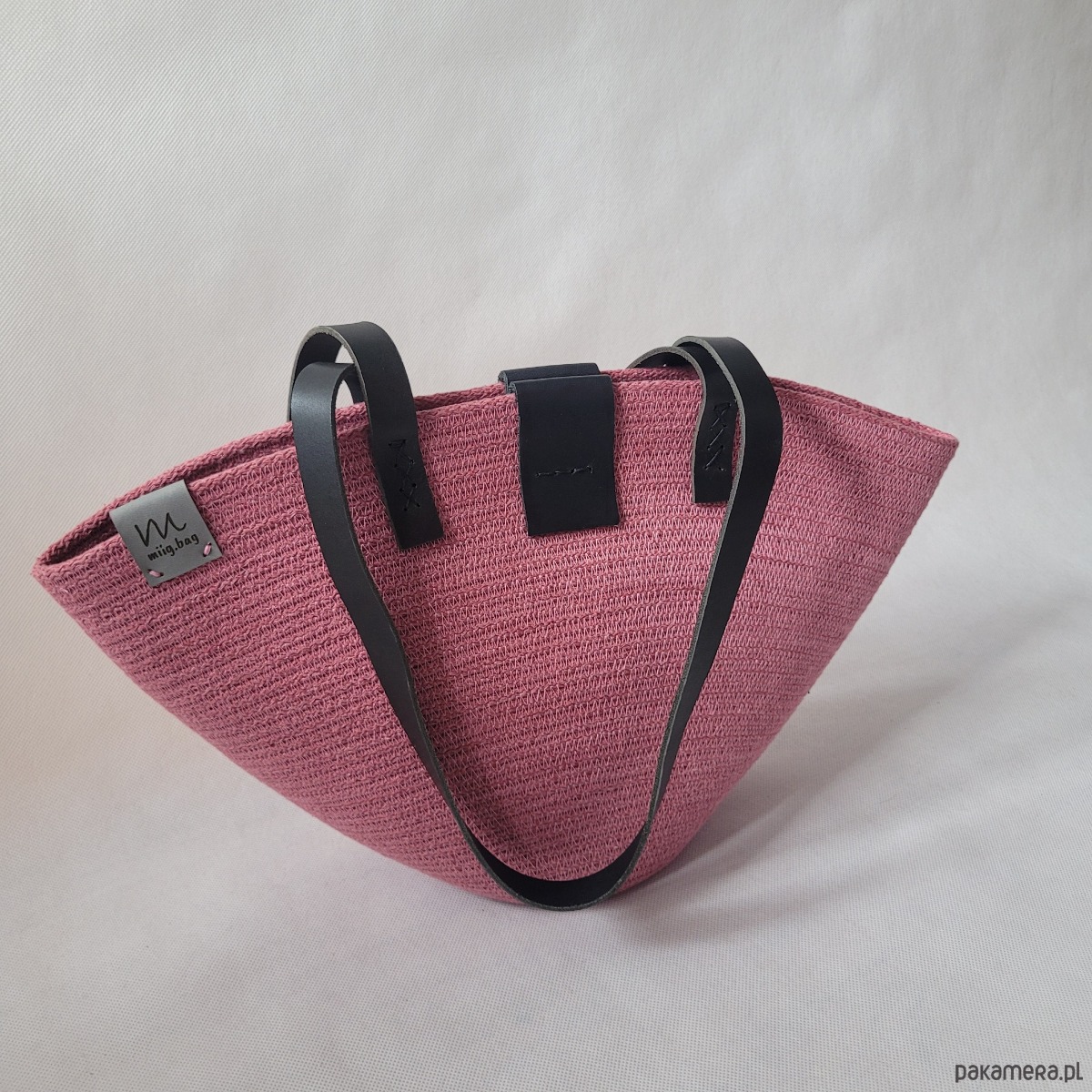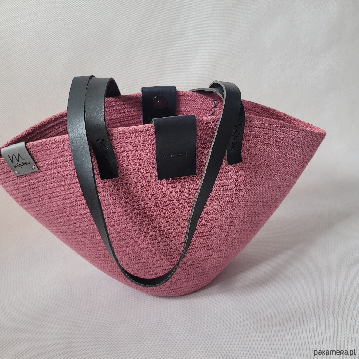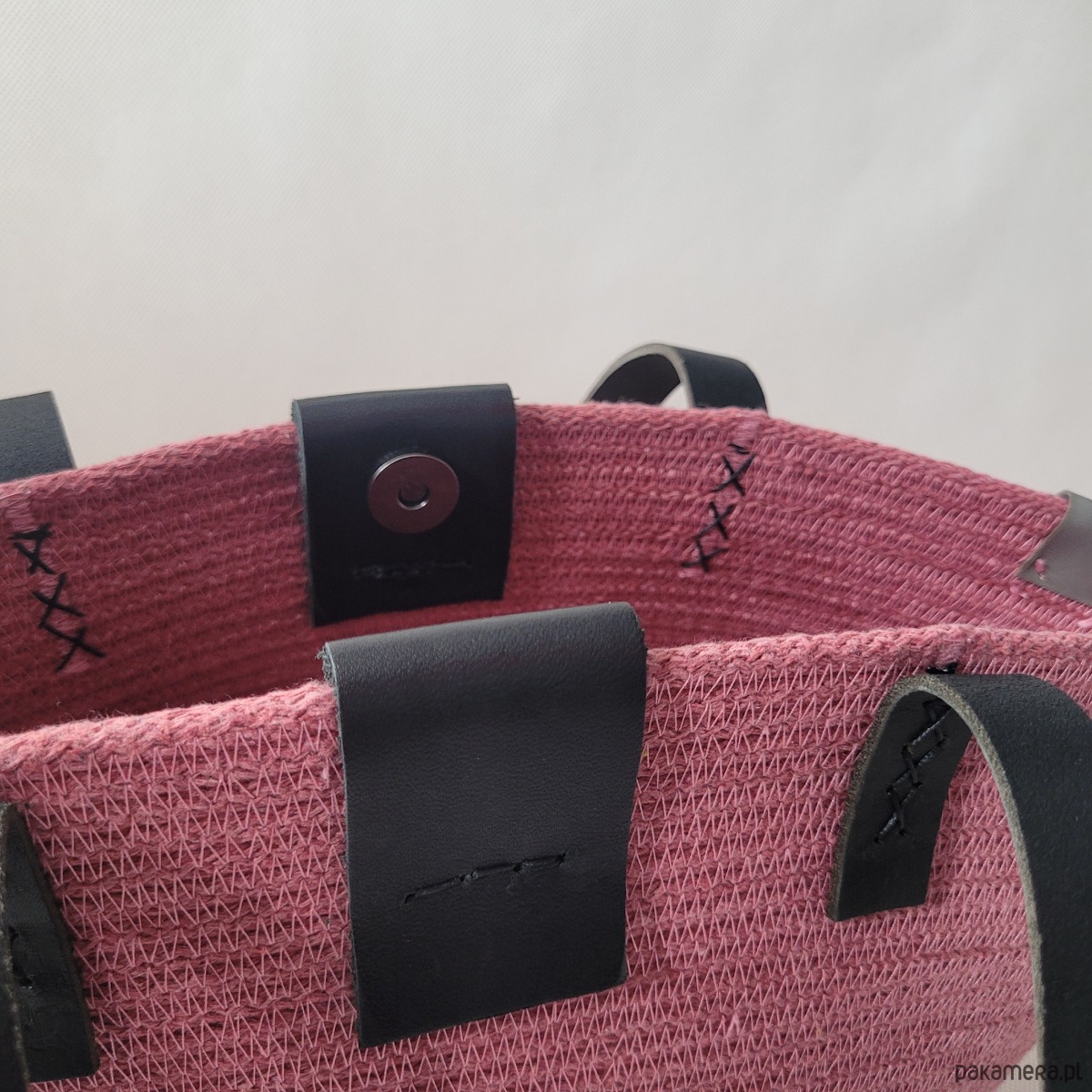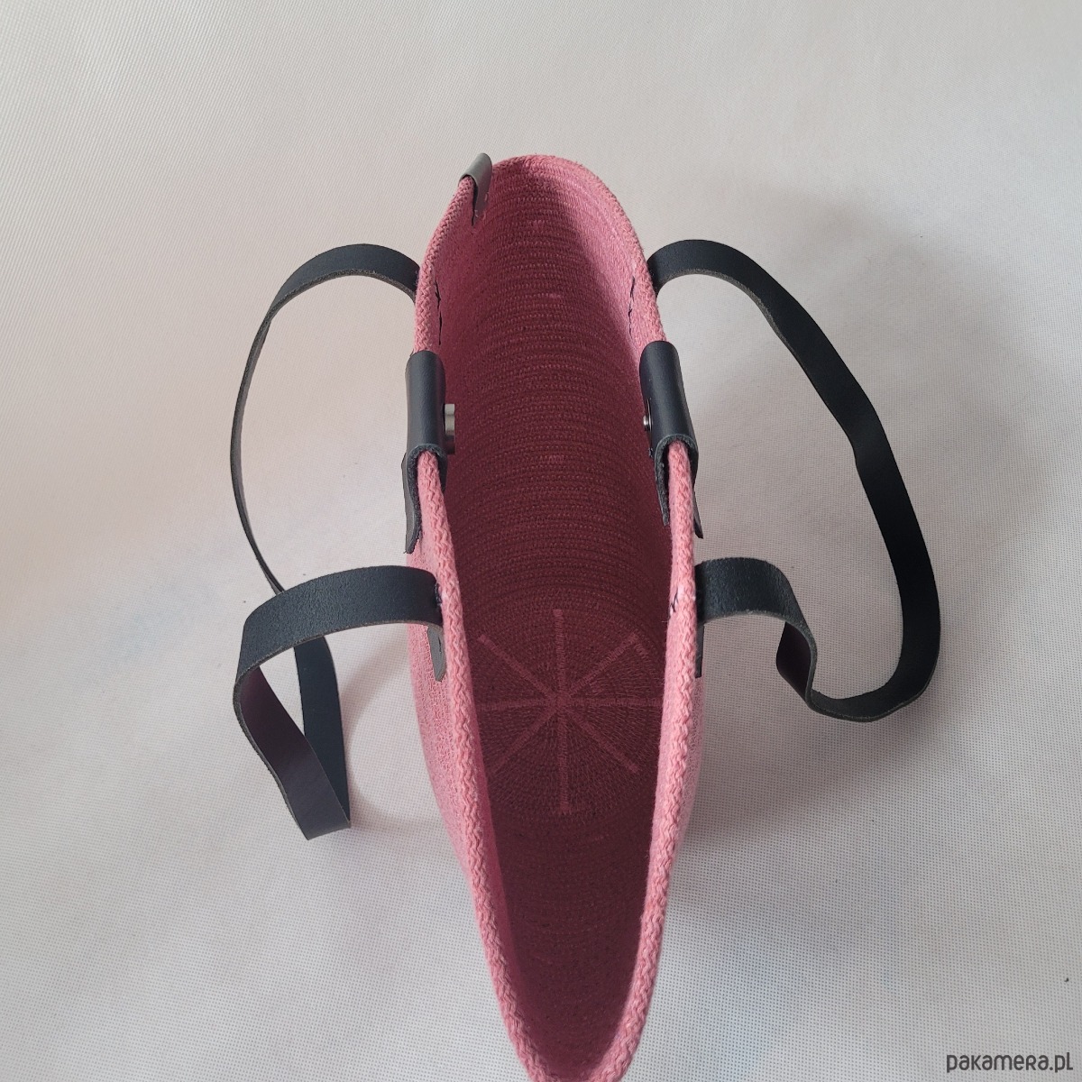 Torebka koszyk miejski, szyta ręcznie ze sztywnego sznurka bawełnianego o grubości 5mm. Idealny wybór dla ceniących unikatowe akcesoria, będzie funkcjonalnym i pięknym dodatkiem. Kosz posiada wygodne rączki, jest lekki I pojemny. Ma małe zapiecie na magnes w kolorze rączek. Rączki i zapiecie są zrobione ze skory naturalnej garbowanej roślinnie, mocowane do torebki za pomocą nici.