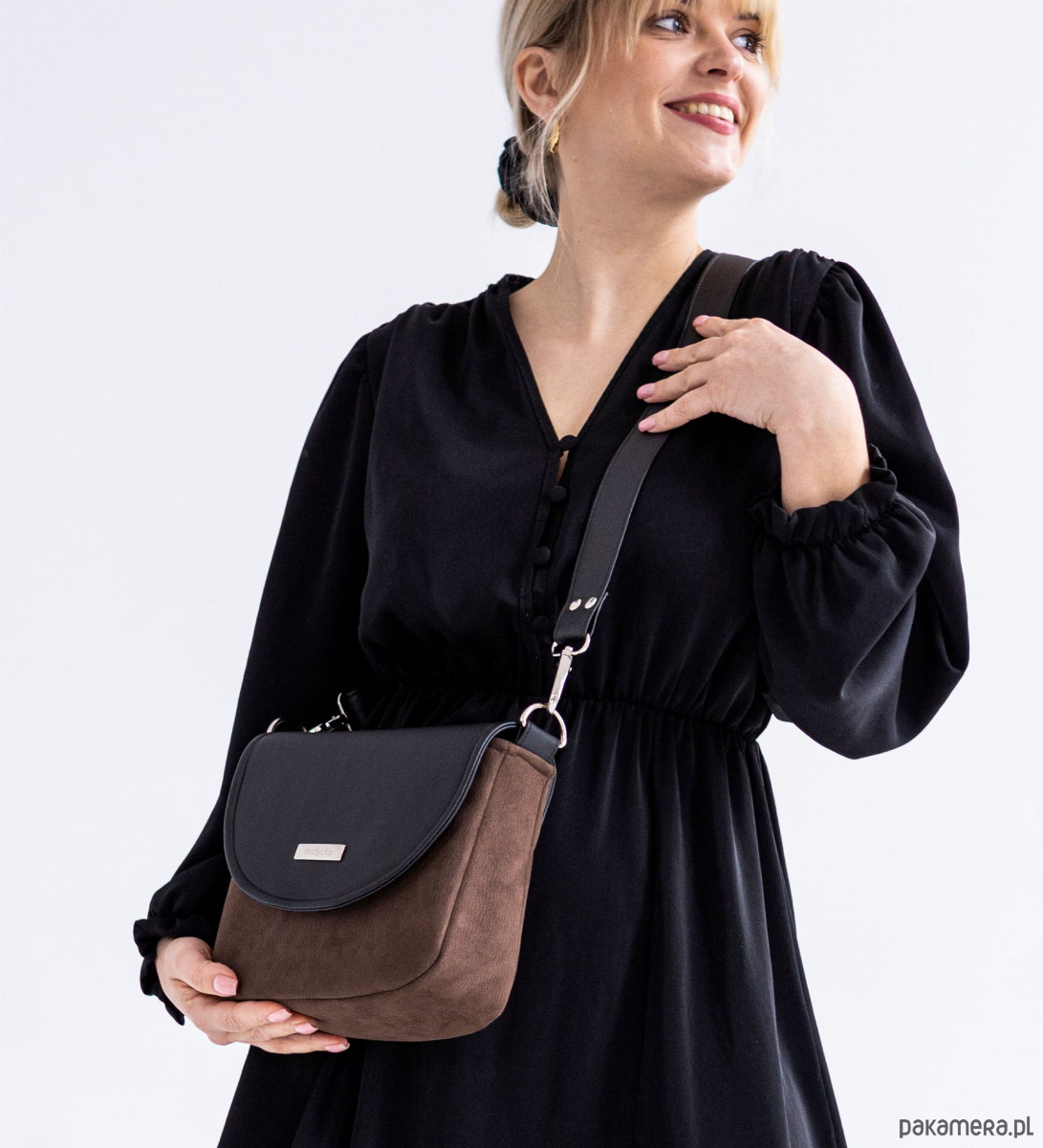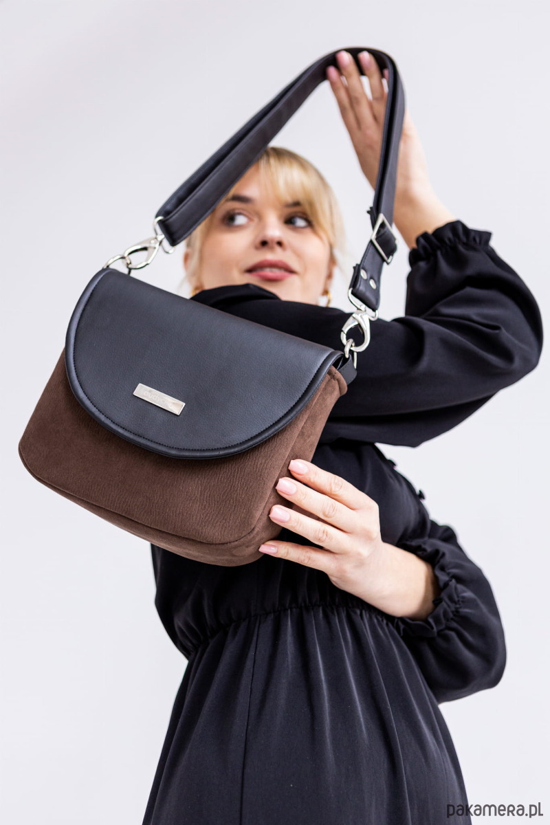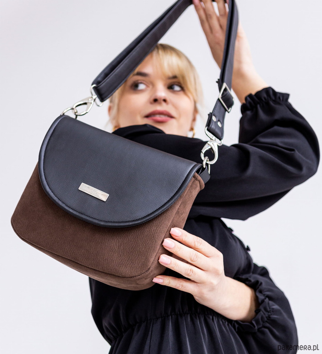 Torebka listonoszka podkówka czekoladowy brąz z czarną klapką