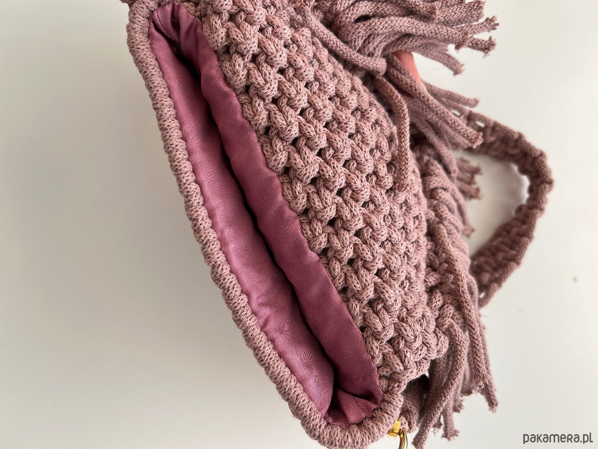 Torebka makramowa wykonana z 100% bawełnianego sznurka w kolorze wrzosowym. Posiada wszytą podszewkę. Torebka w stylu boho, do noszenia na ramię. Idealna na wiosnę i lato.