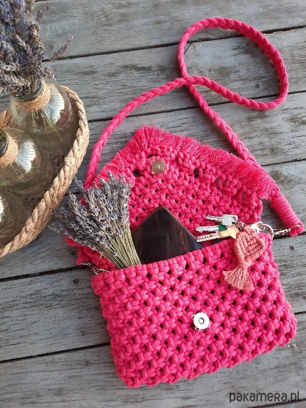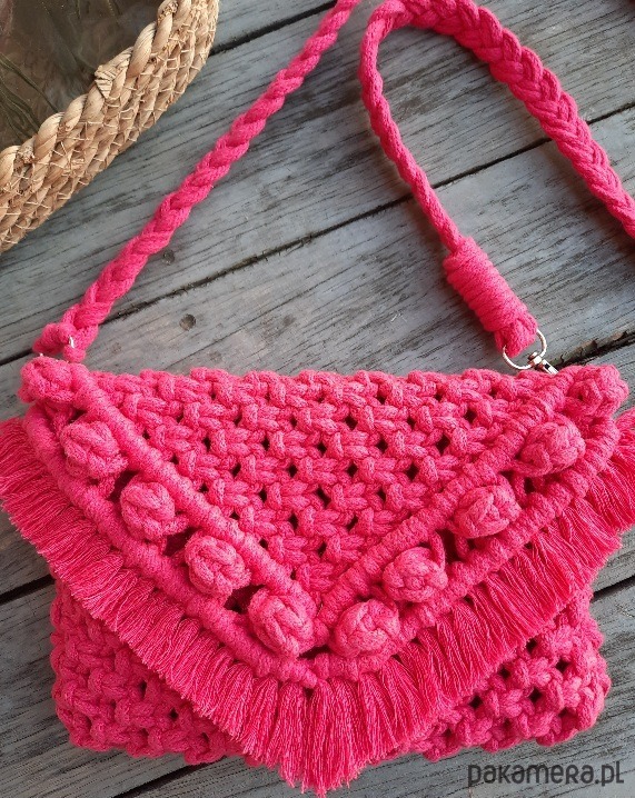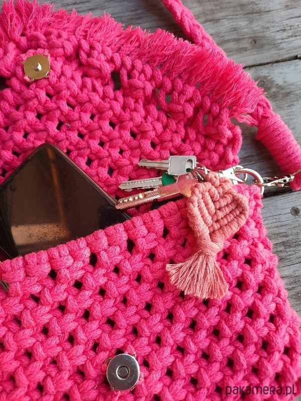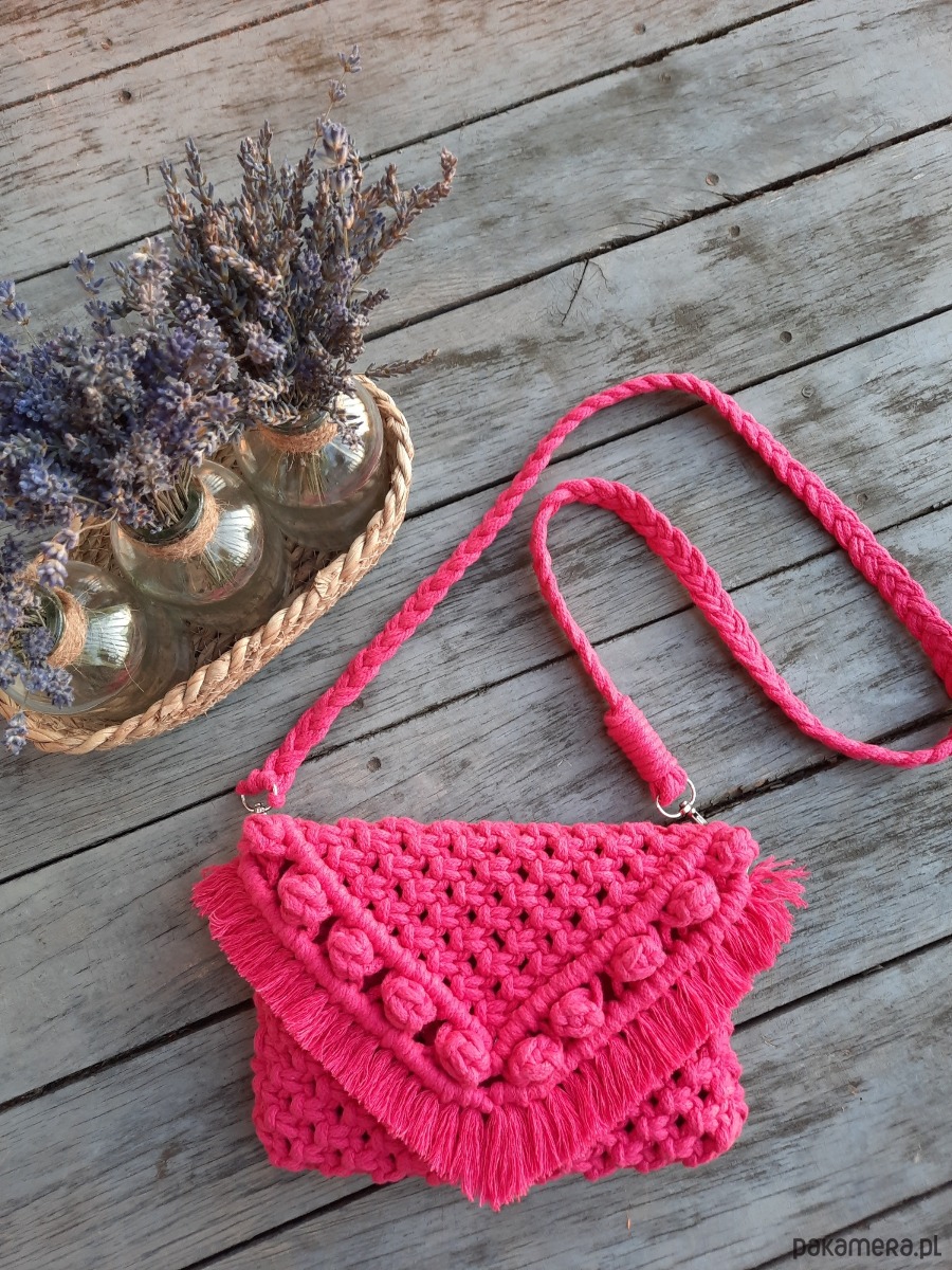Ręcznie robiona letnia torebka makramowa w cudownie energetycznym kolorze fuksji.
