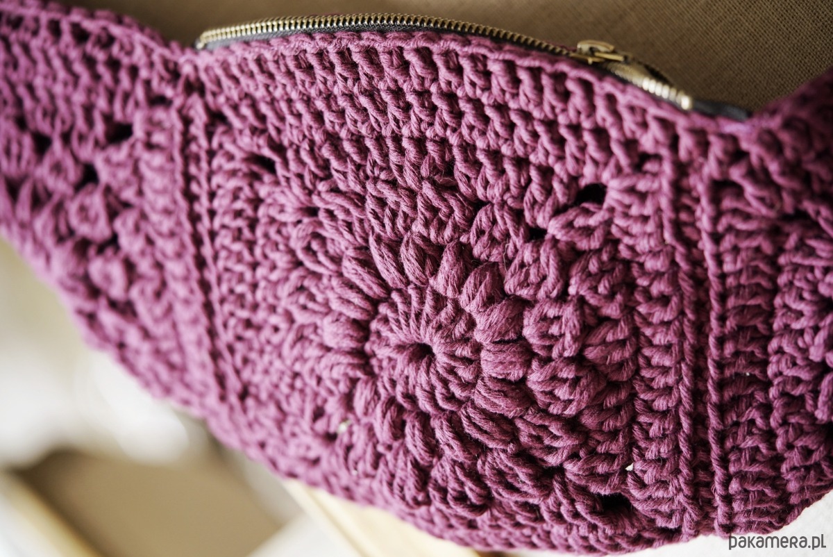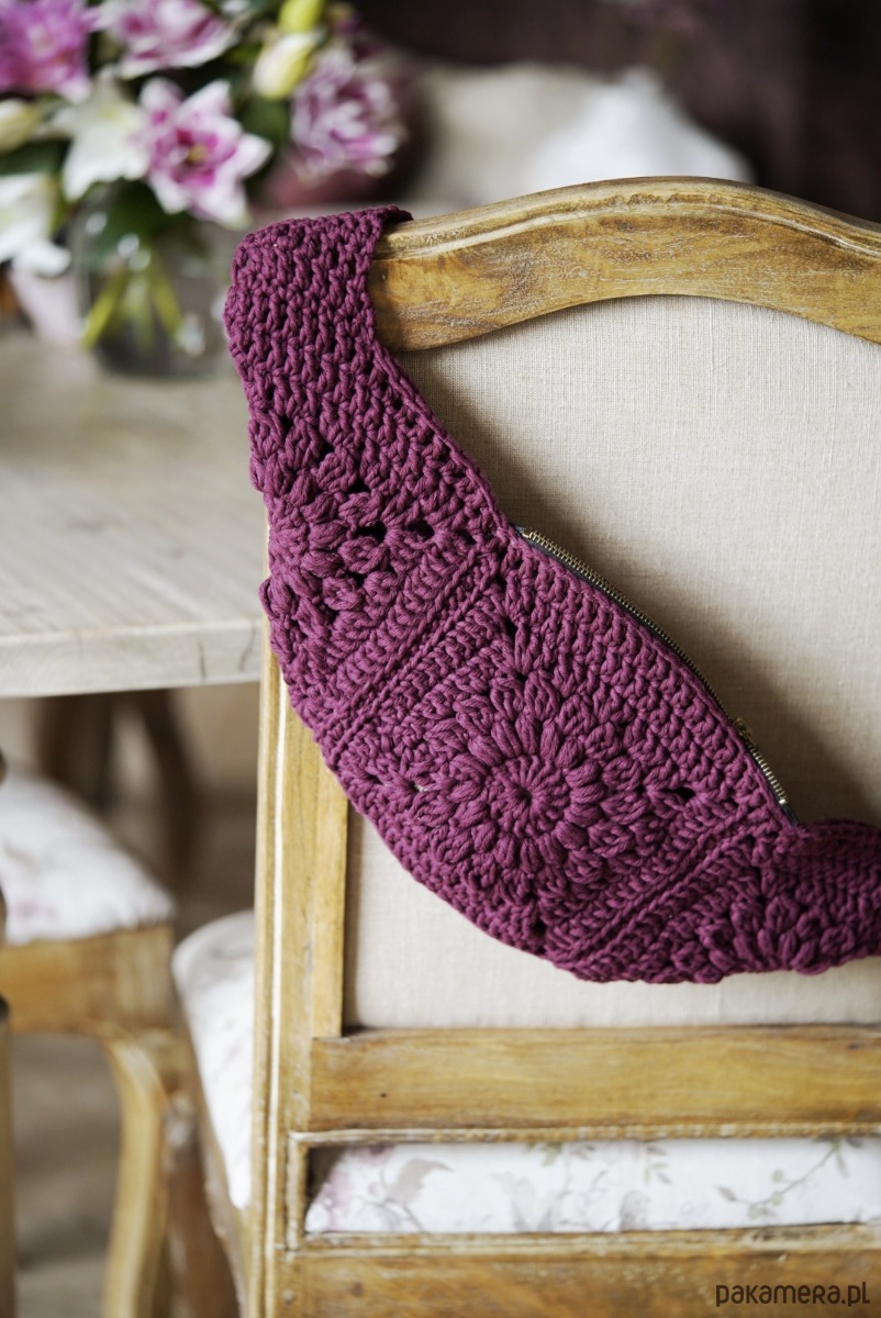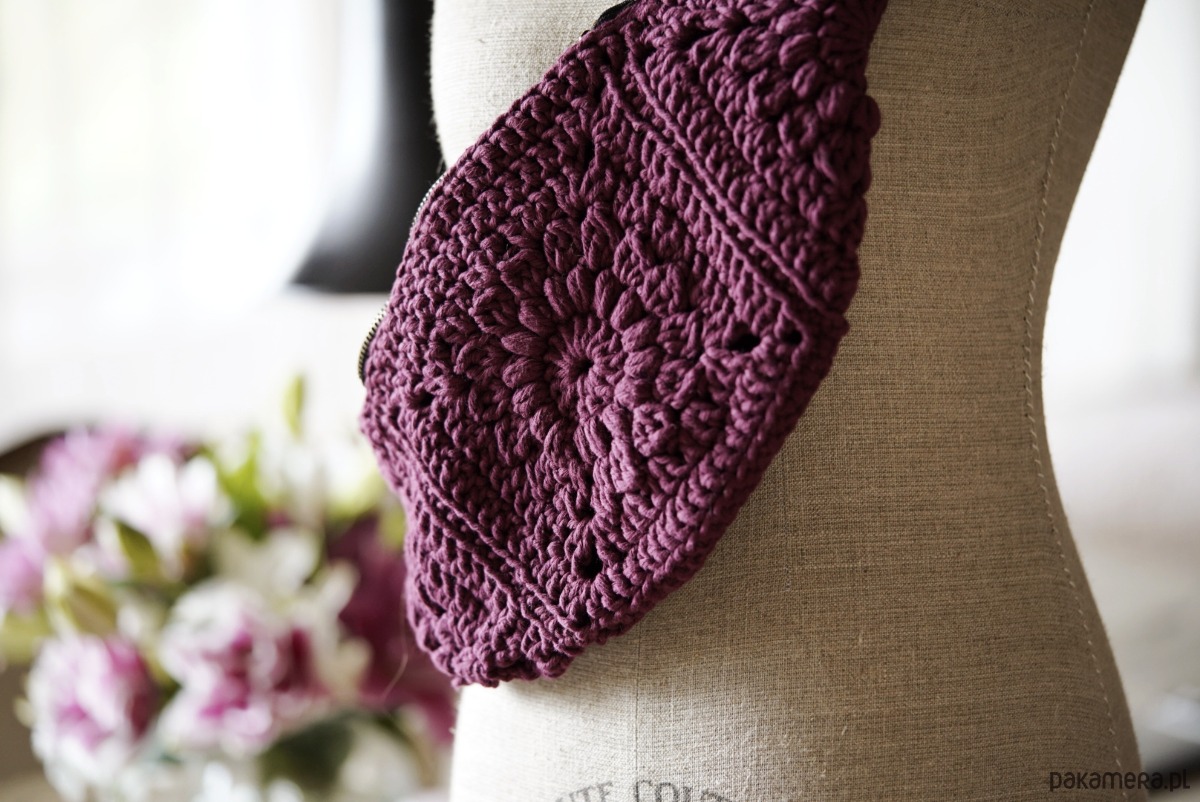 Ręcznie robiona za pomocą szydełka torebka "nerka" z amarantowego , wieloskrętnego sznurka.