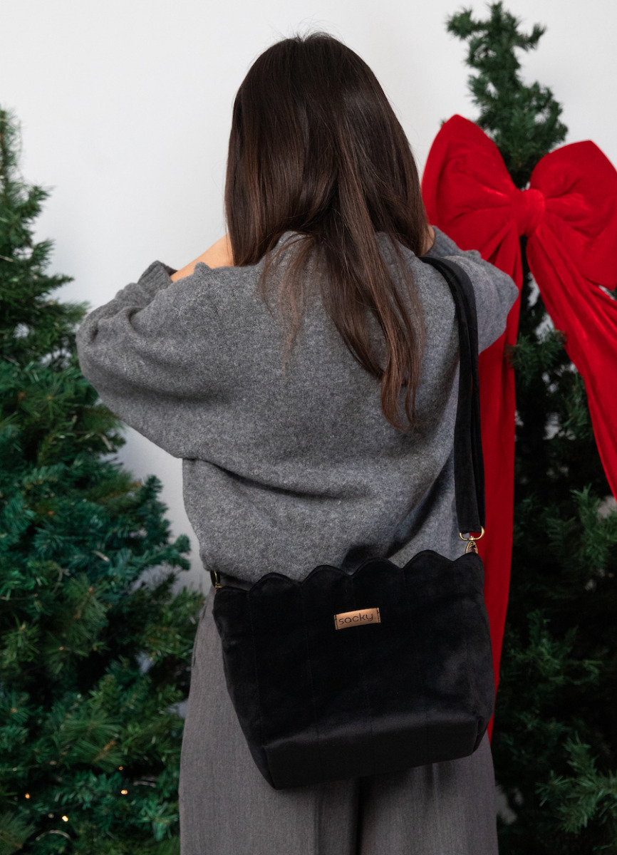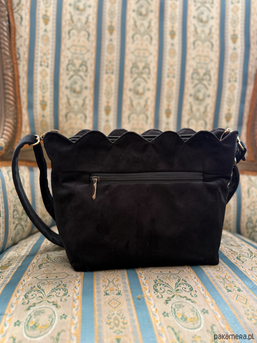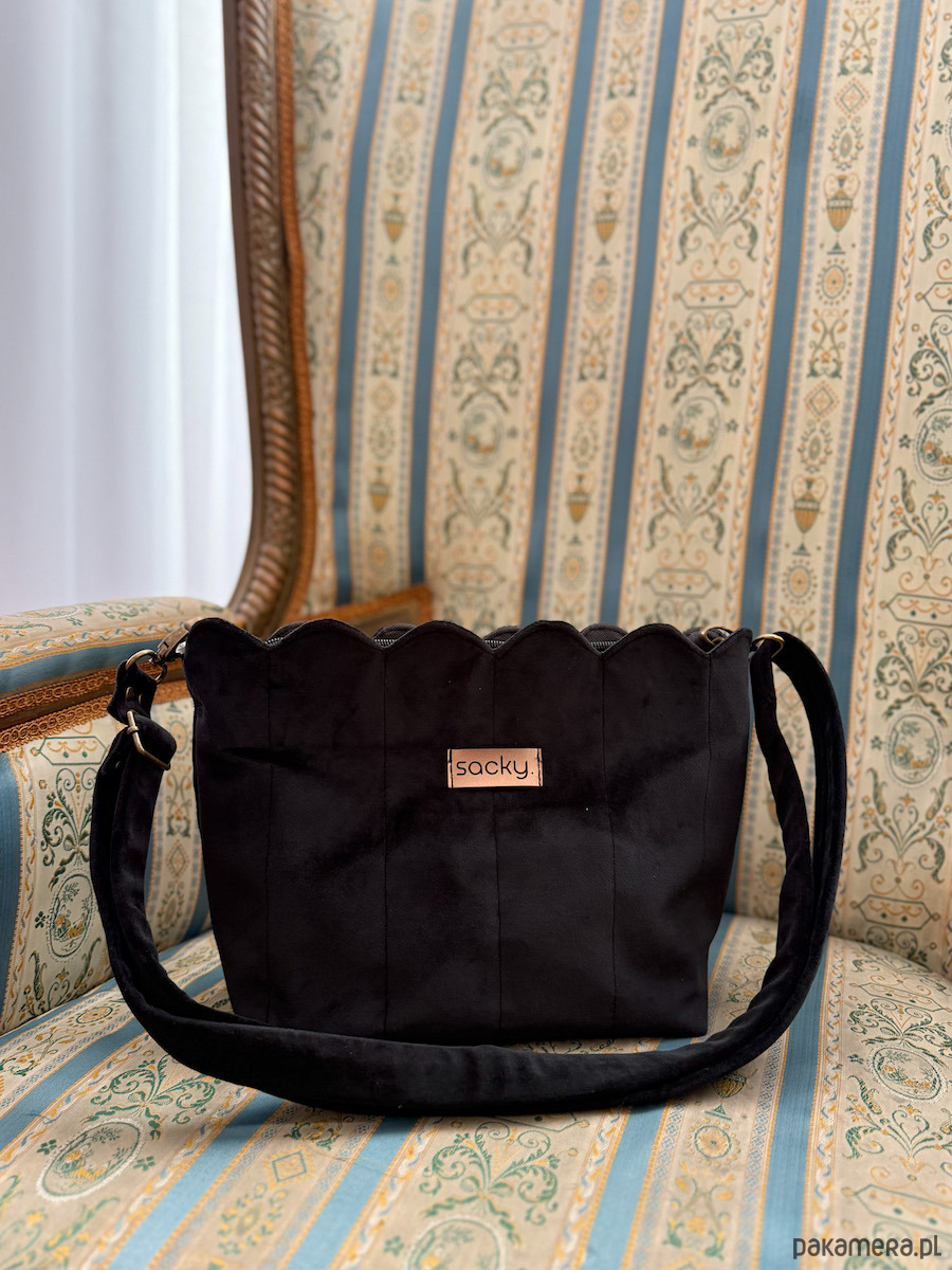 Listonoszka welurowa muffin czarna z falowanym ozdobnym brzegiem dopełni Twoje stylizacje! Zapinana na zamek torebka z elegancką wodoodporną podszewką pod kolor torby. Wewnątrz torba ma kieszeń na zamek oraz smyczkę z karabińczykiem do dopięcia kluczy.