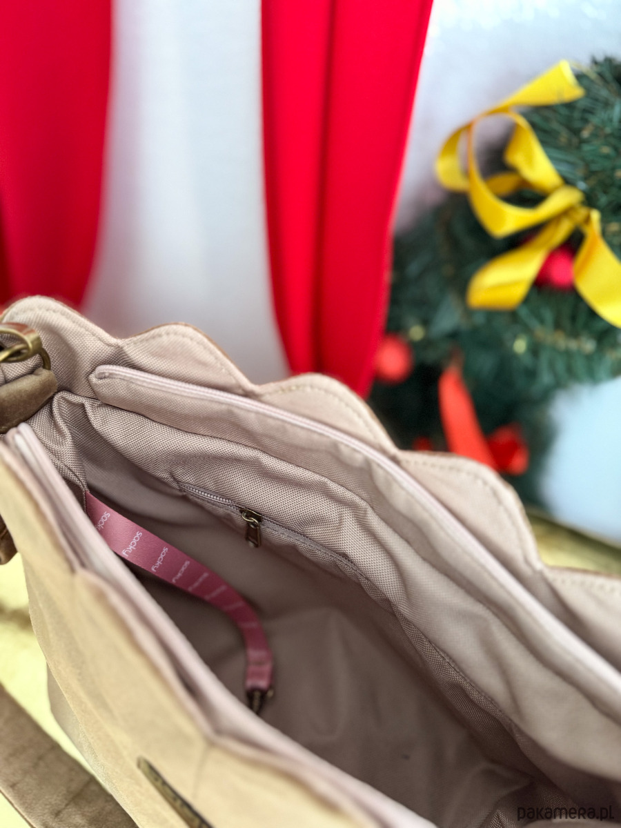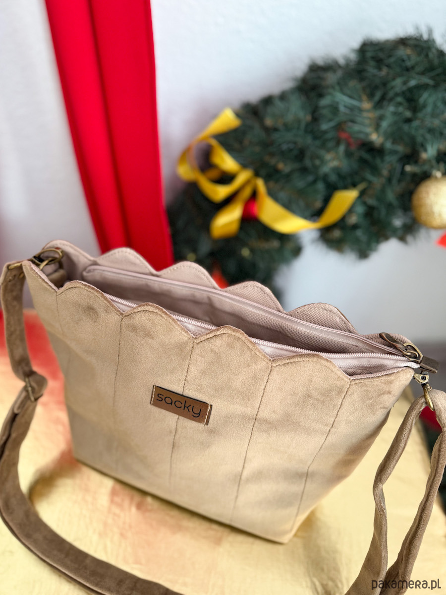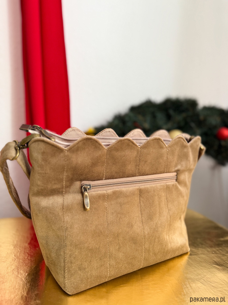 Listonoszka welurowa muffin toffi z falowanym ozdobnym brzegiem dopełni Twoje stylizacje! Zapinana na zamek torebka z elegancką wodoodporną podszewką pod kolor torby. Wewnątrz torba ma kieszeń na zamek oraz smyczkę z karabińczykiem do dopięcia kluczy.