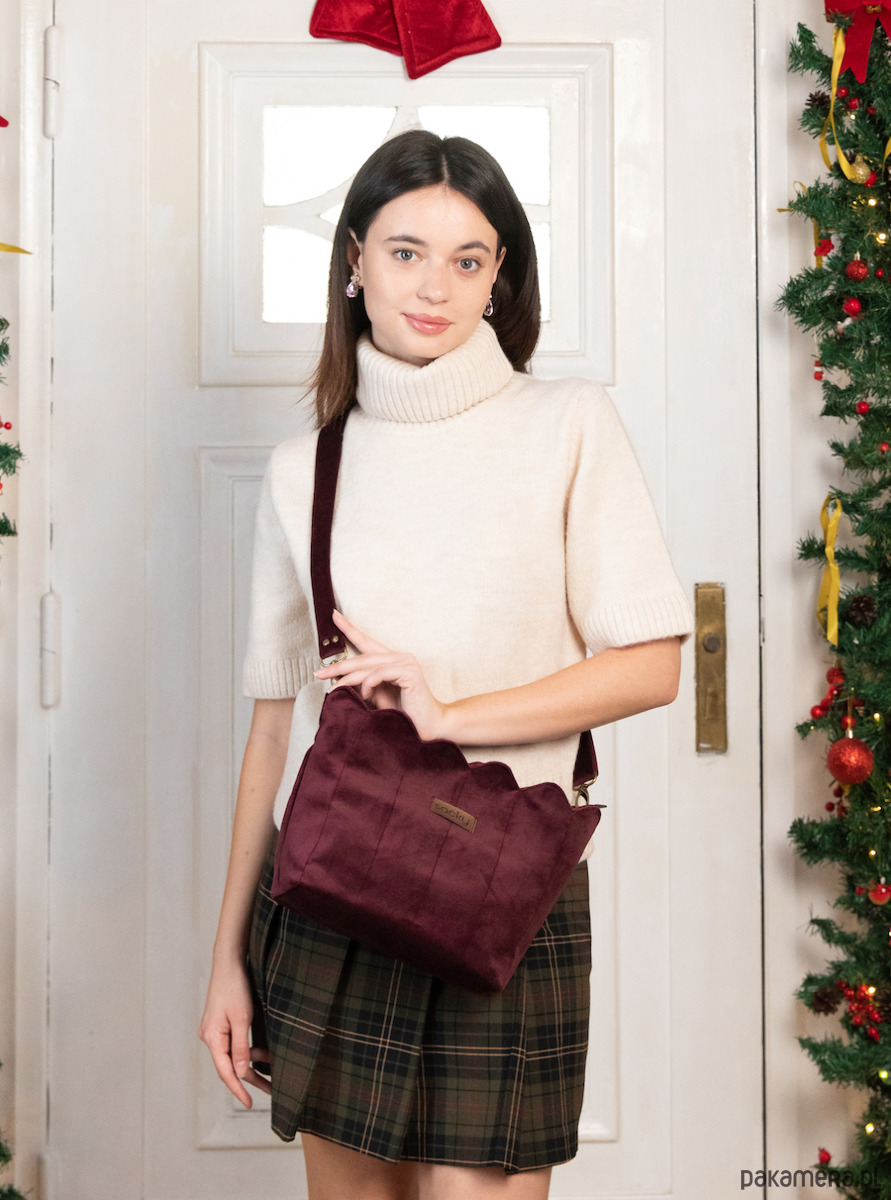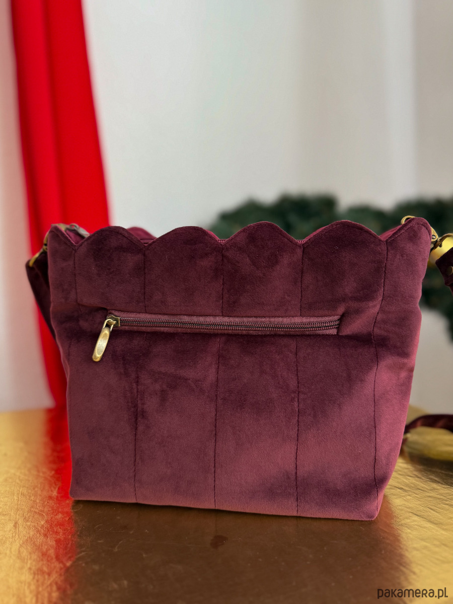 Listonoszka welurowa muffin wino z falowanym ozdobnym brzegiem dopełni Twoje stylizacje! Zapinana na zamek torebka z elegancką wodoodporną podszewką pod kolor torby. Wewnątrz torba ma kieszeń na zamek oraz smyczkę z karabińczykiem do dopięcia kluczy.