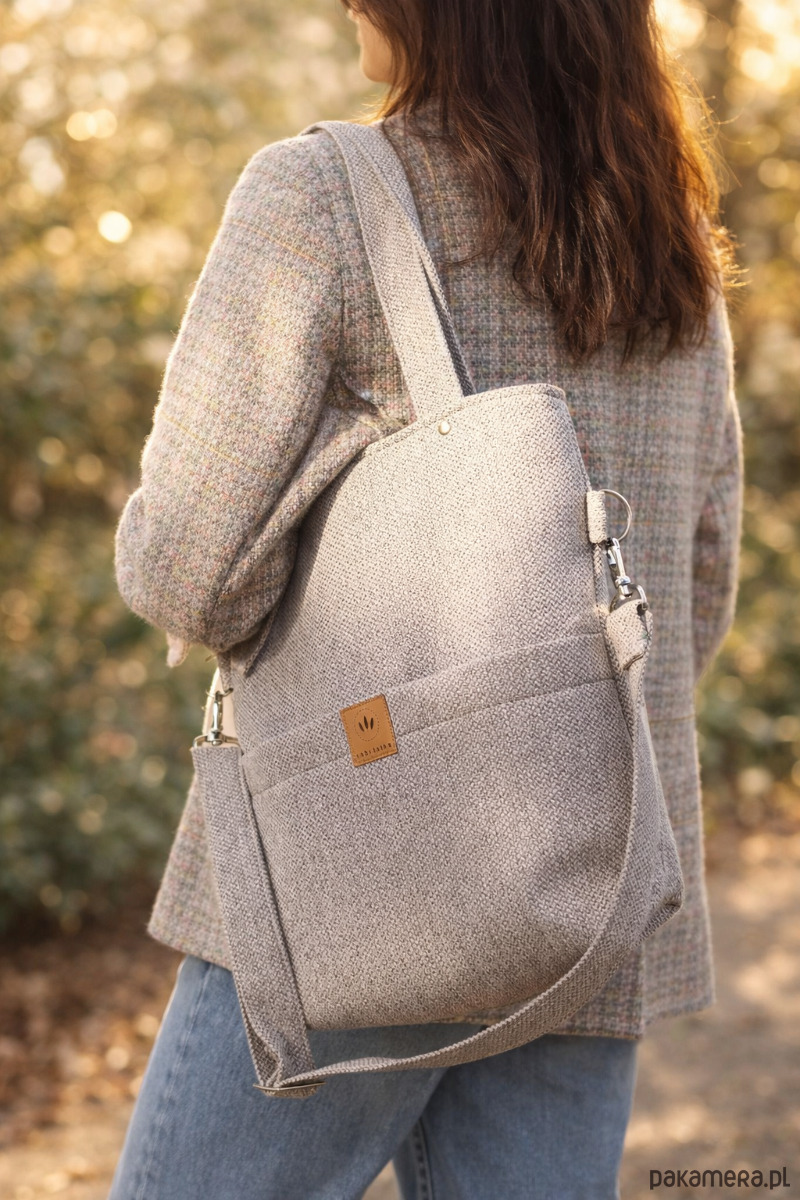 Prostokątna torebka z kieszeniami na froncie z tkaniny o wyczuwalnym, grubym splocie.