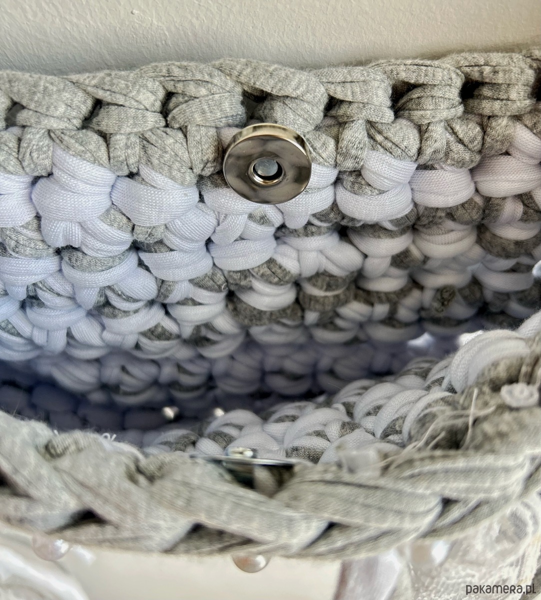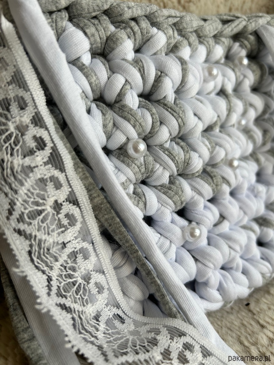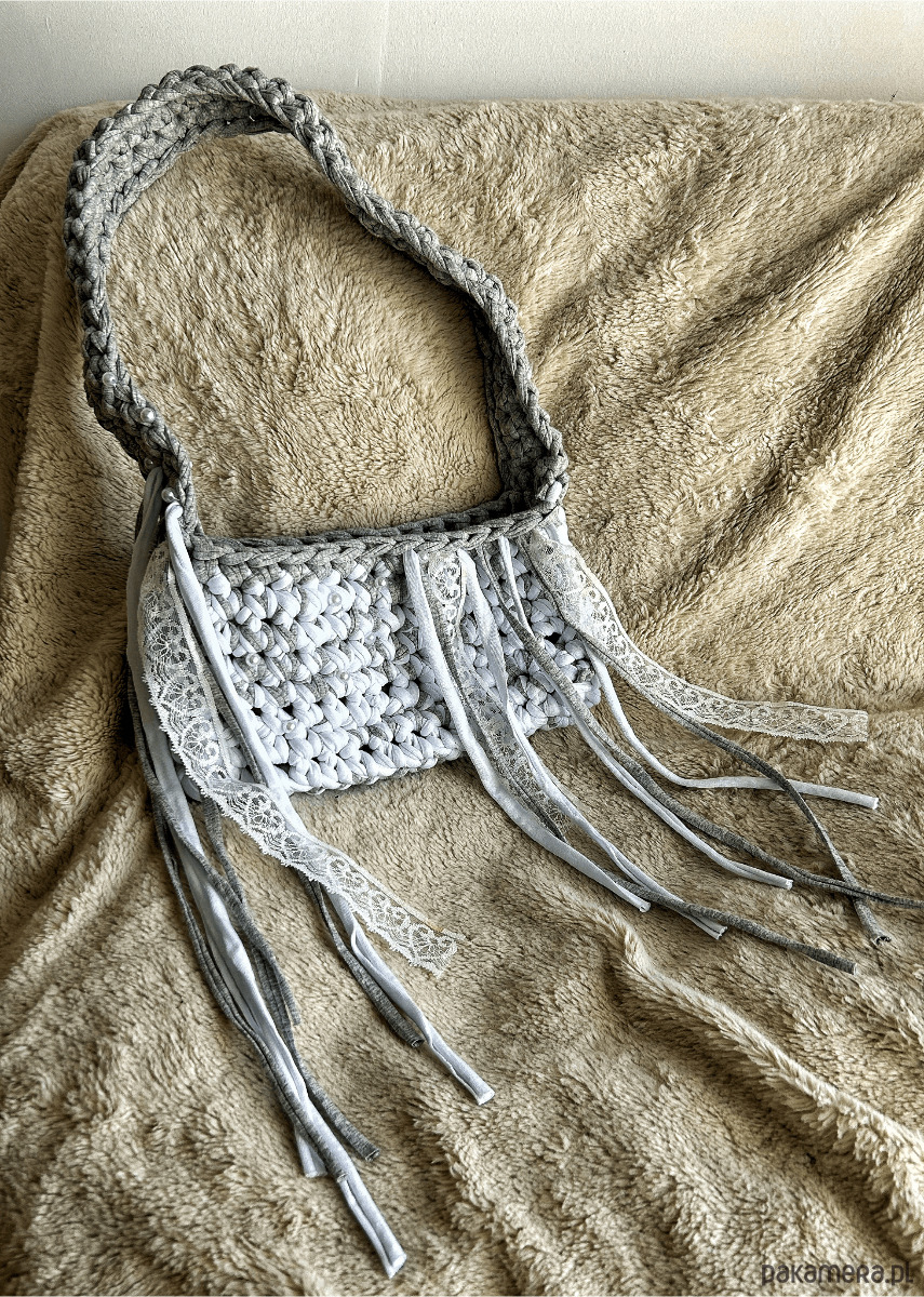 Połączenie miękkiej szarości i czystej bieli nadaje jej lekkości i elegancji, a starannie dobrane ozdoby — koronkowe tasiemki, drobne perełki oraz swobodnie opadające frędzle — tworzą harmonijną, wyjątkową kompozycję.