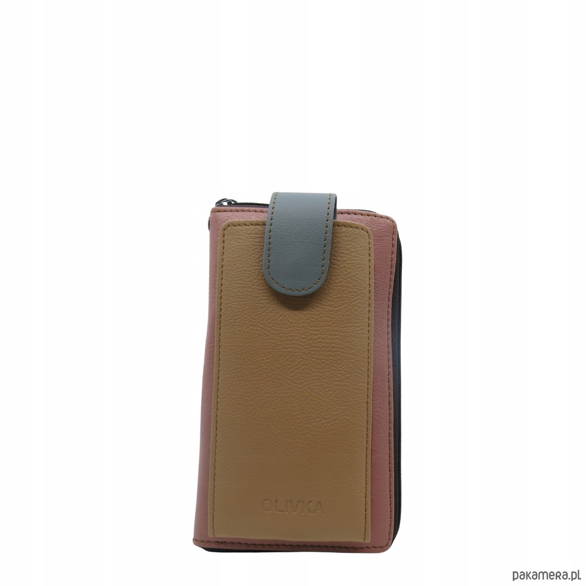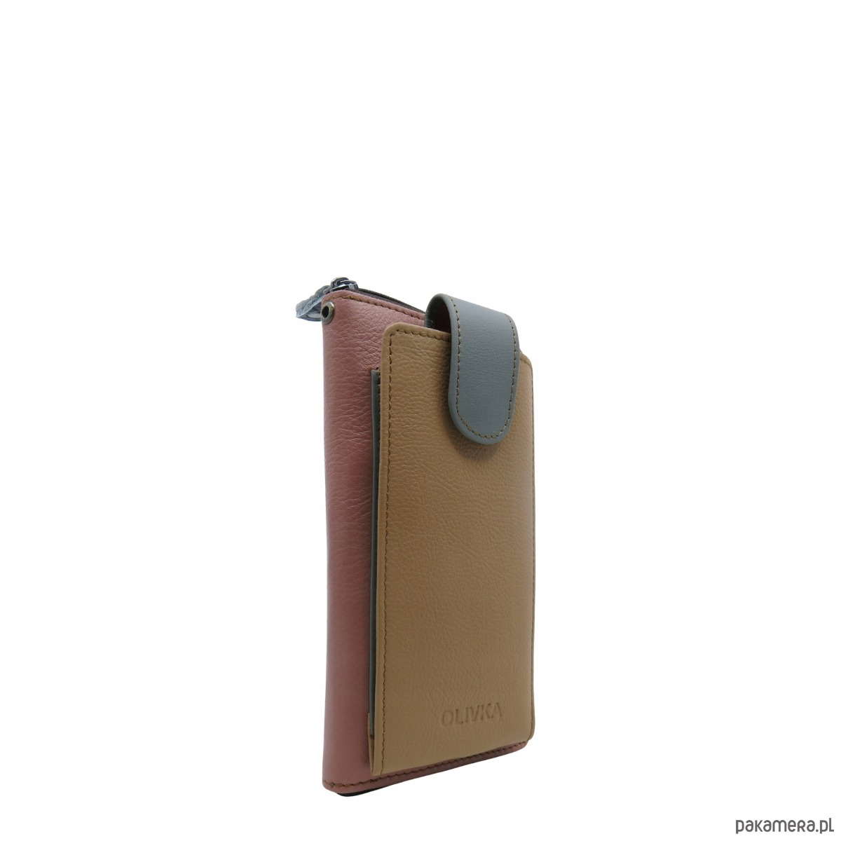 Torebka na telefon portfel 2w1 skórzany dwa paski pojemny zero waste OLIVKA