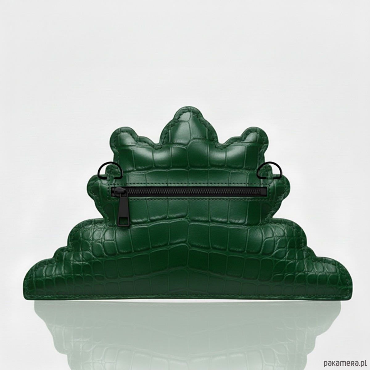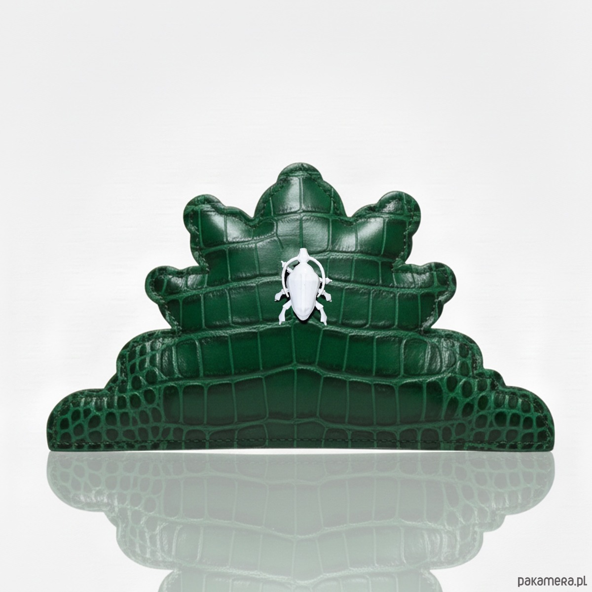 Torebka kopertówka wykonana ręcznie ze skóry naturalnej licowej o wyraźnej fakturze. Kształt został zaprojektowany na bazie szablonu artystki NeSpoon. Z przodu znajduje się ozdobny element w formie skarabeusza, wykonany w technologii druku 3D z materiału w kolorze białym. Torebka zamykana na zamek błyskawiczny umieszczony z tyłu. Jednokomorowe wnętrze. Wyposażona jest w odpinany i regulowany pasek na ramię, dzięki czemu można ją nosić zarówno w dłoni jako klasyczną kopertówkę, jak i na ramieniu. Krawędzie cięte i lakierowane.
