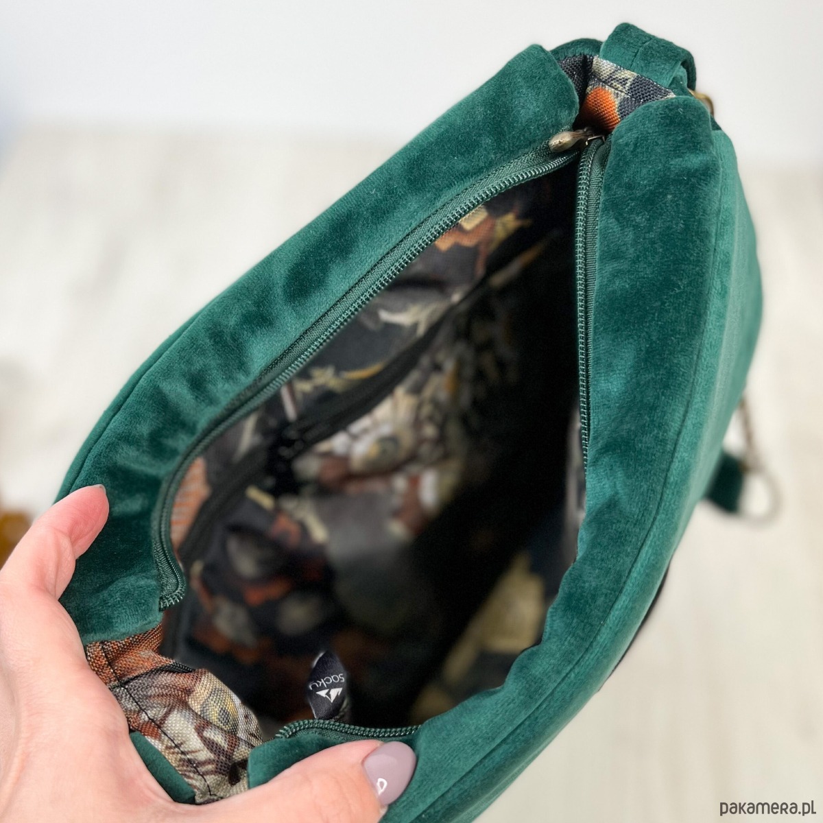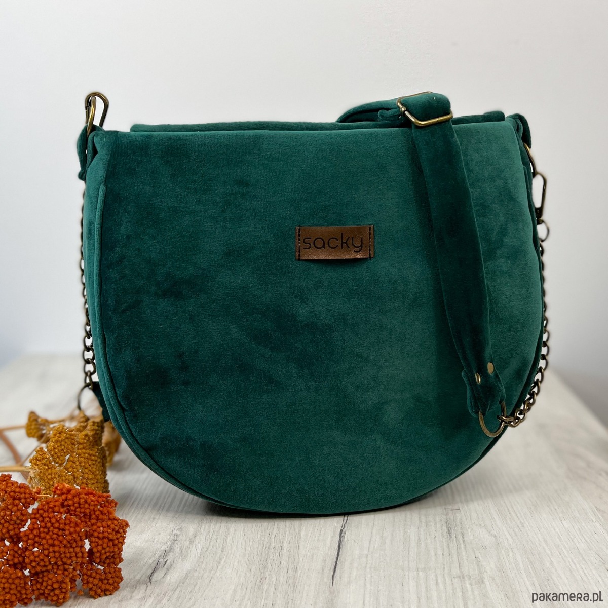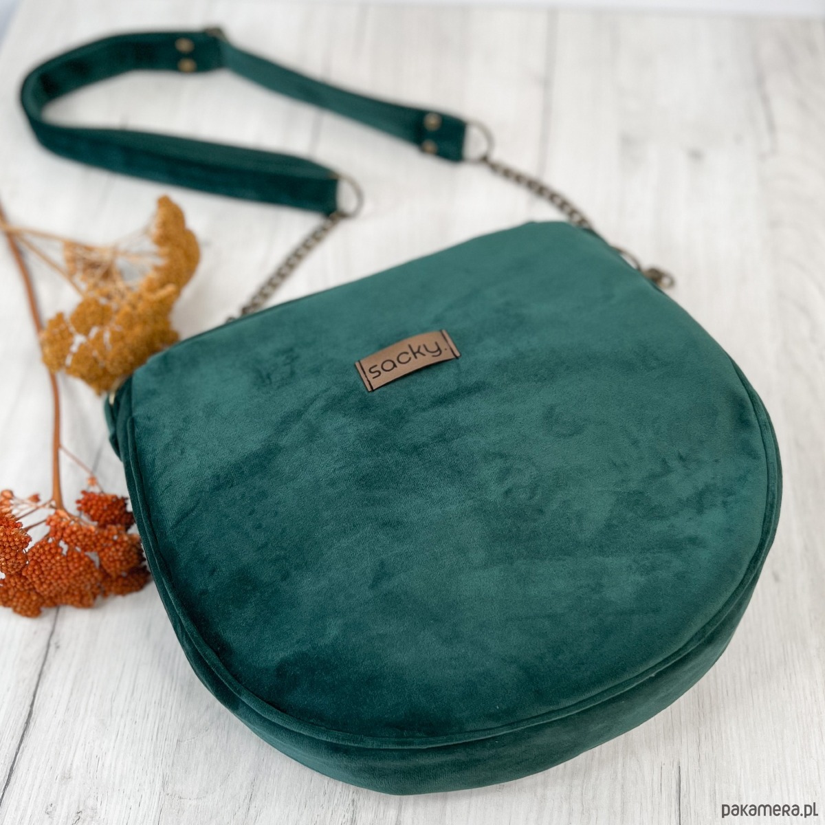 Torebka okrągła butelkowa zieleń to nasza elegancka propozycja torebki na cały rok. Torebka wykonana jest z miękkiej tkaniny welurowej i jej główna komora jest zapinana na zamek. Na tyle znajduje się duża zamykana na zamek kieszeń. Regulowany, odpinany pasek jest wykonany z połączenia tkaniny welurowej i łańcuszka metalowego. Wewnątrz torebka podszyta jest wodoodporną podszewką w kwiatowym wzorze oraz ma zapinaną kieszeń na drobiazgi. Wybierz to co lubisz! Do torebki możesz dobrać dodaki metalowe w kolorze starego złota lub srebra.