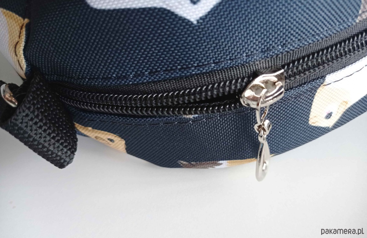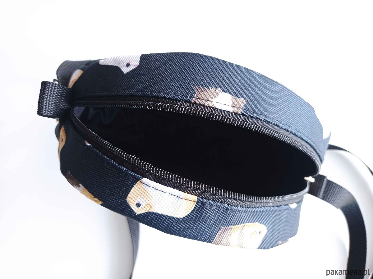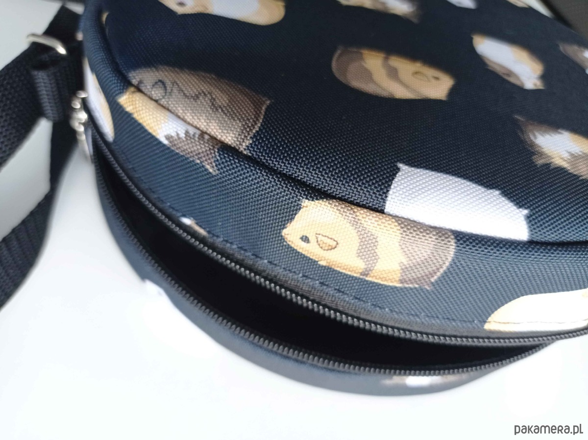 Torba bardzo pojemna, choć nieduża. Zapinana na na suwak. Usztywniona wigofilem. Wewnątrz czarna, gładka podszewka.
