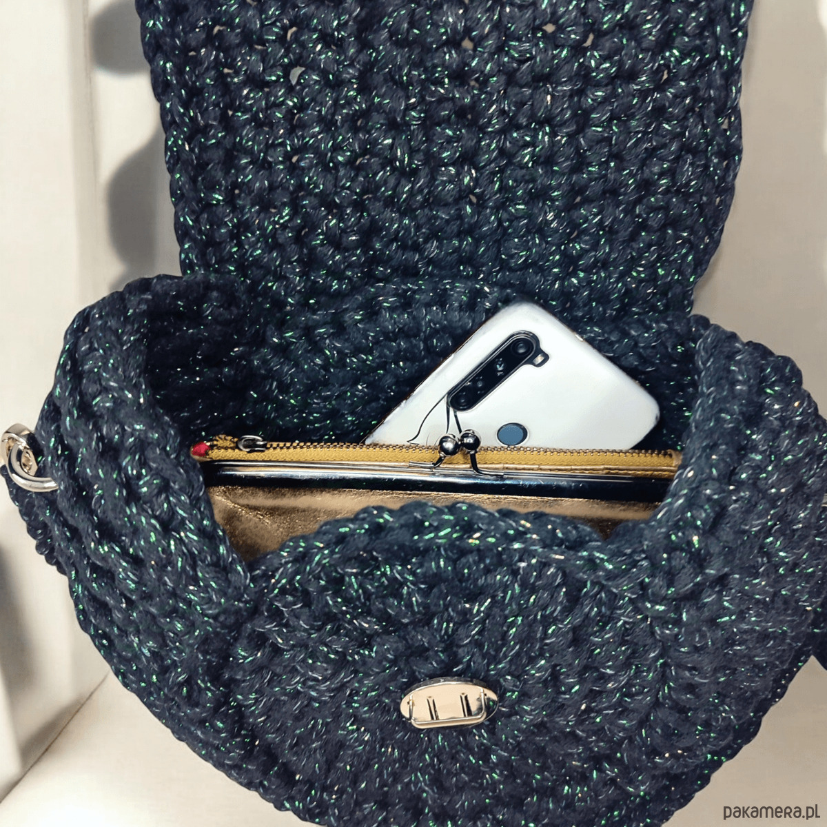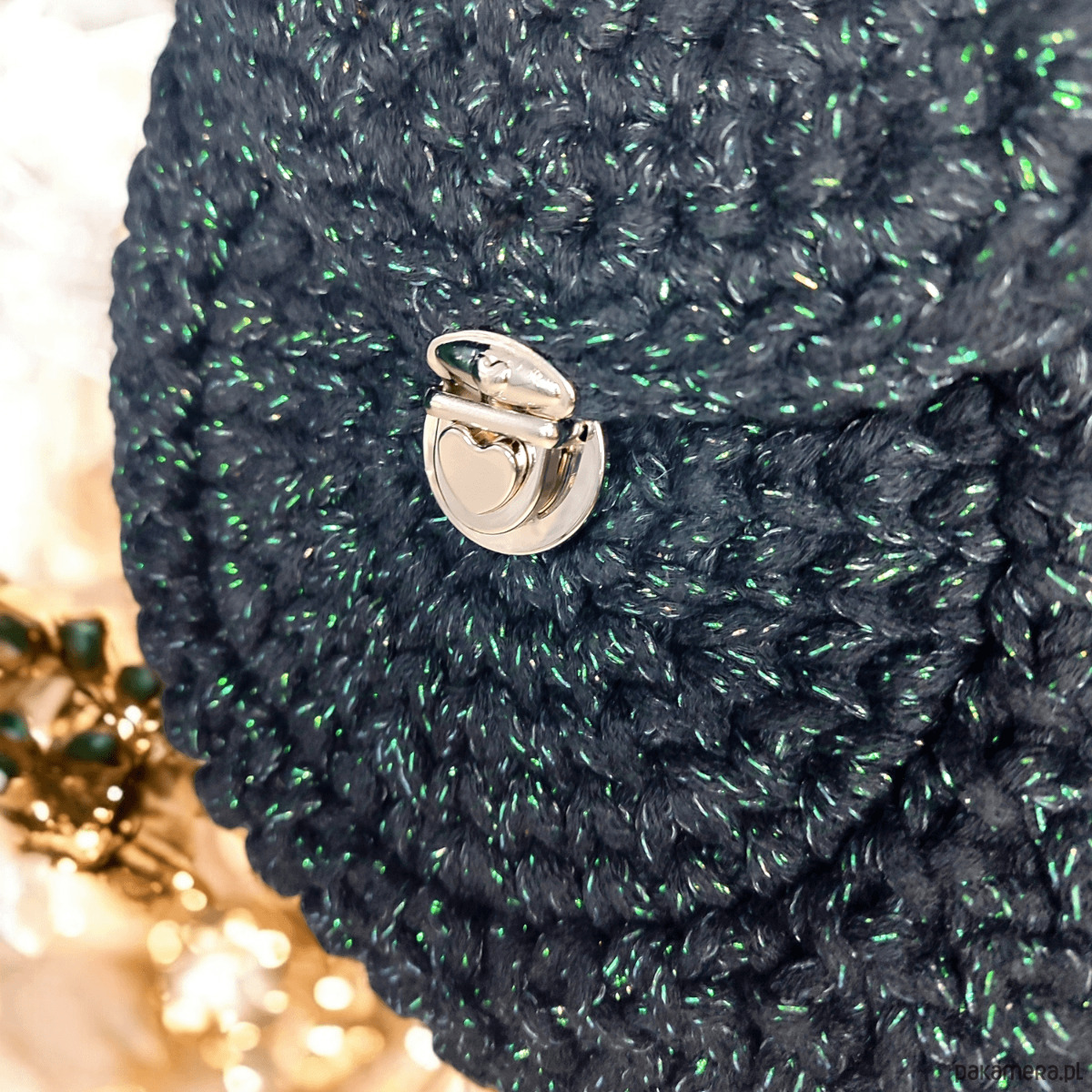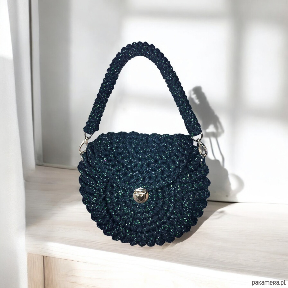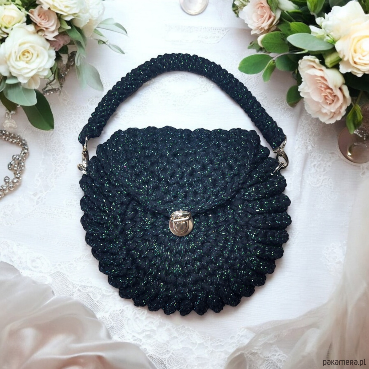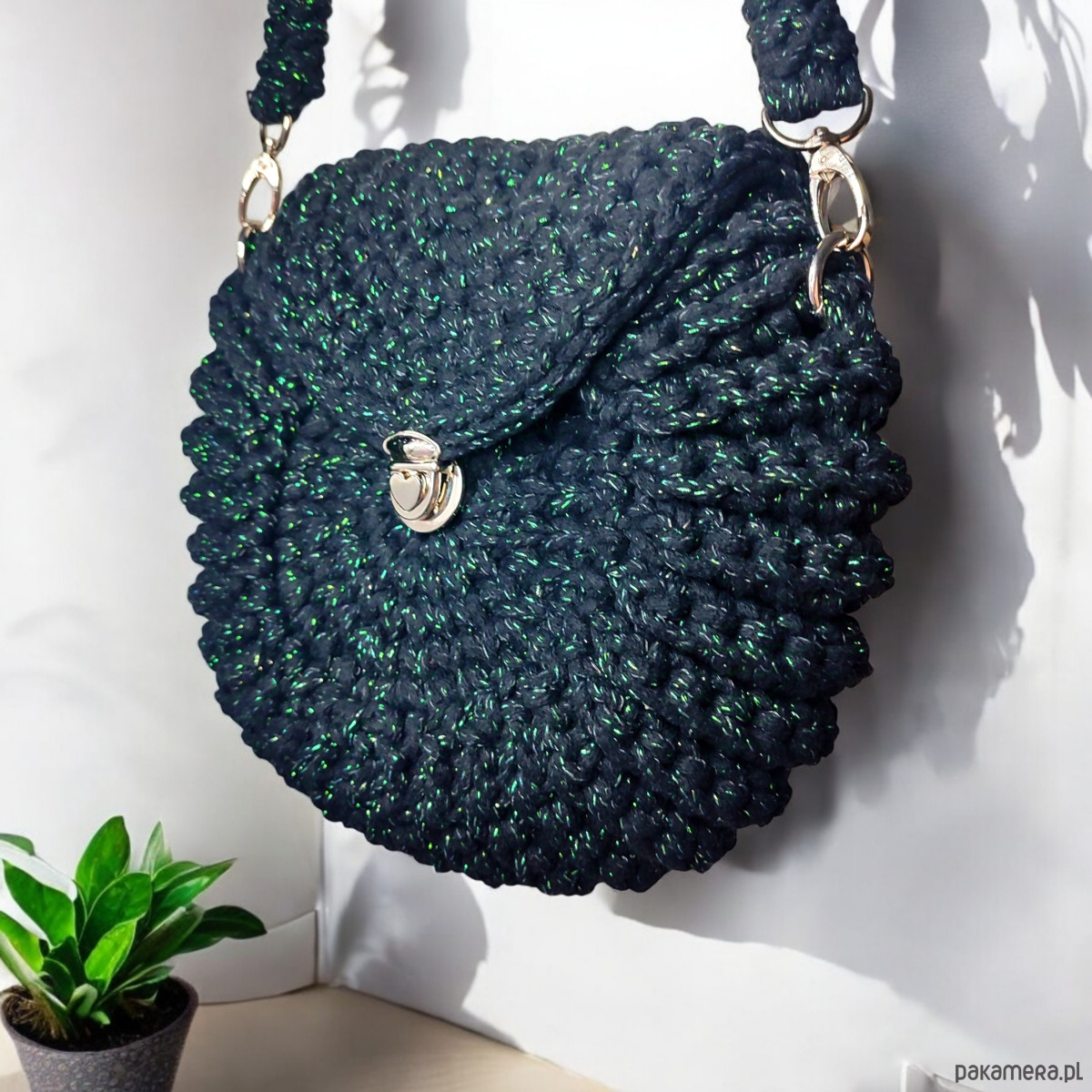 Czarna torebka “Oreo” to wyjątkowy, ręcznie wykonany dodatek z naturalnego bawełnianego sznurka, ozdobiony zieloną błyszczącą nitką. Okrągły kształt przypominający ciasteczko i wygodne zapięcie w kształcie serca łączą styl z funkcjonalnością. Idealna do każdej stylizacji, czarna torebka “Oreo” zachwyca elegancją i oryginalnym designem.