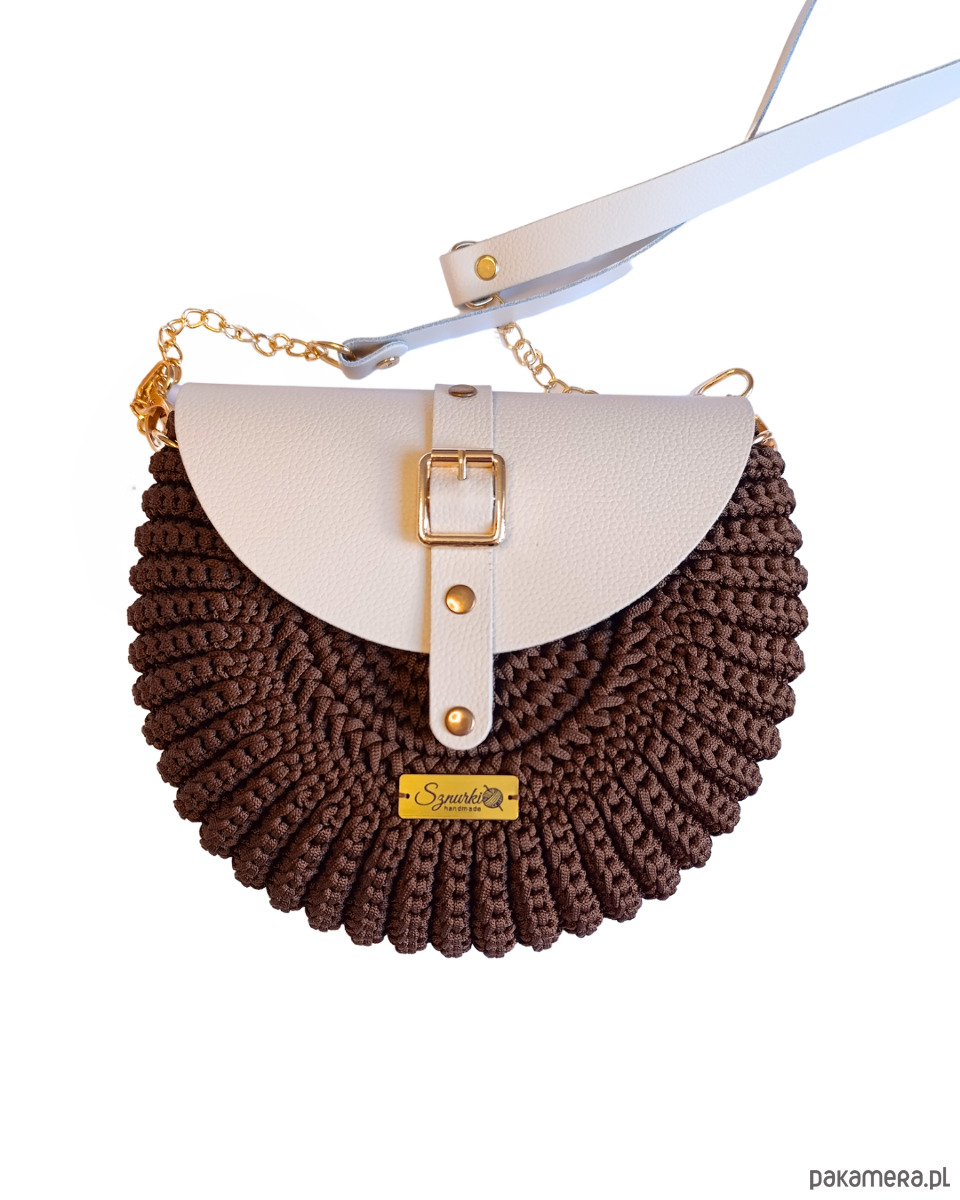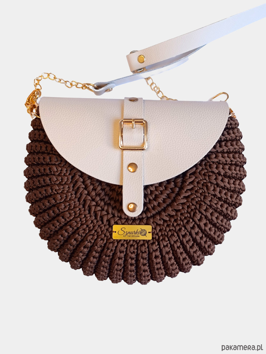 Model ręcznie szydełkowany, z elementami ze skóry naturalnej.