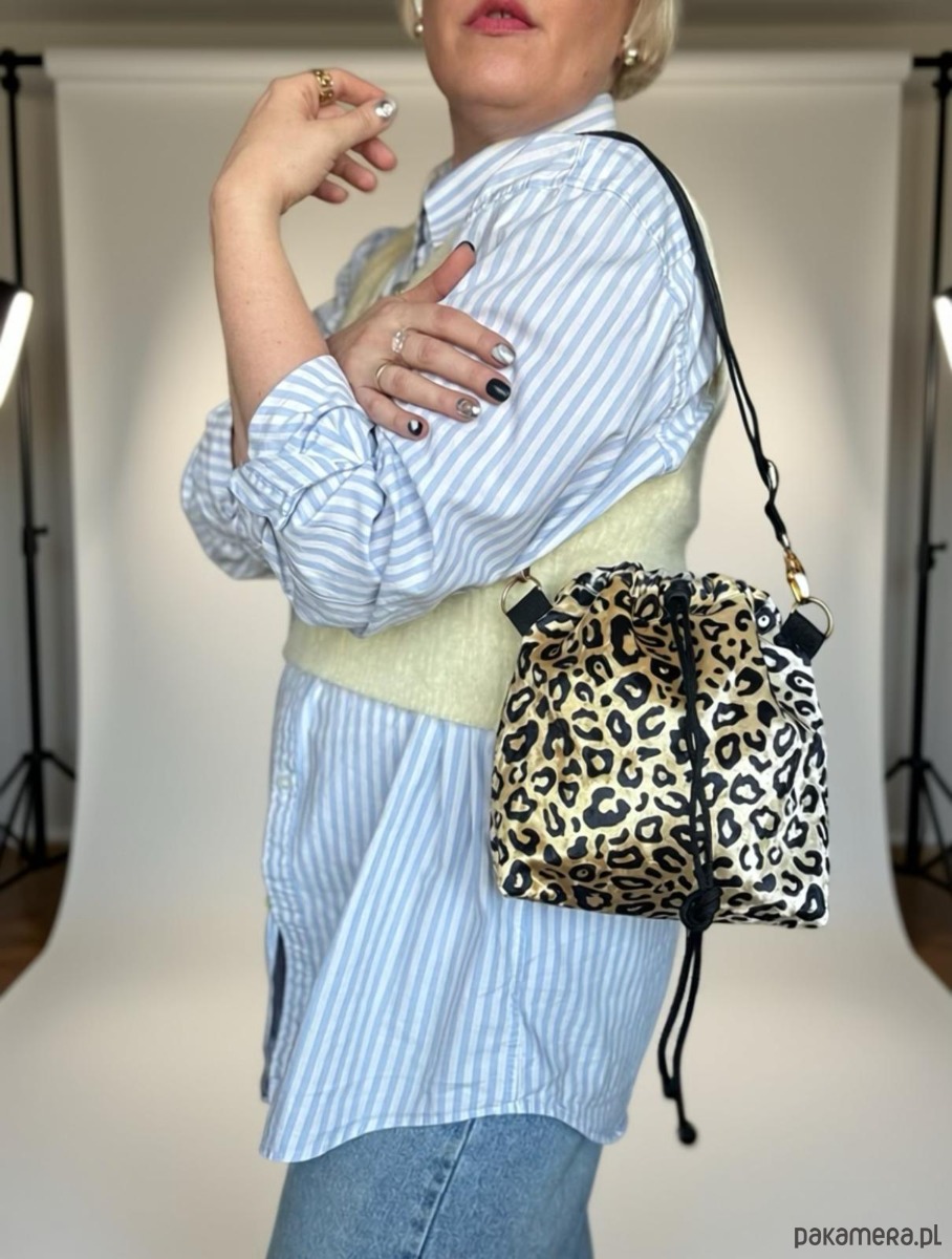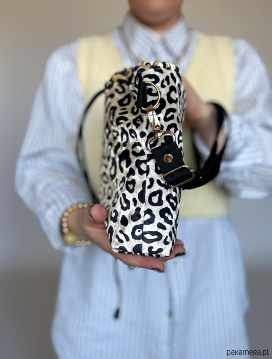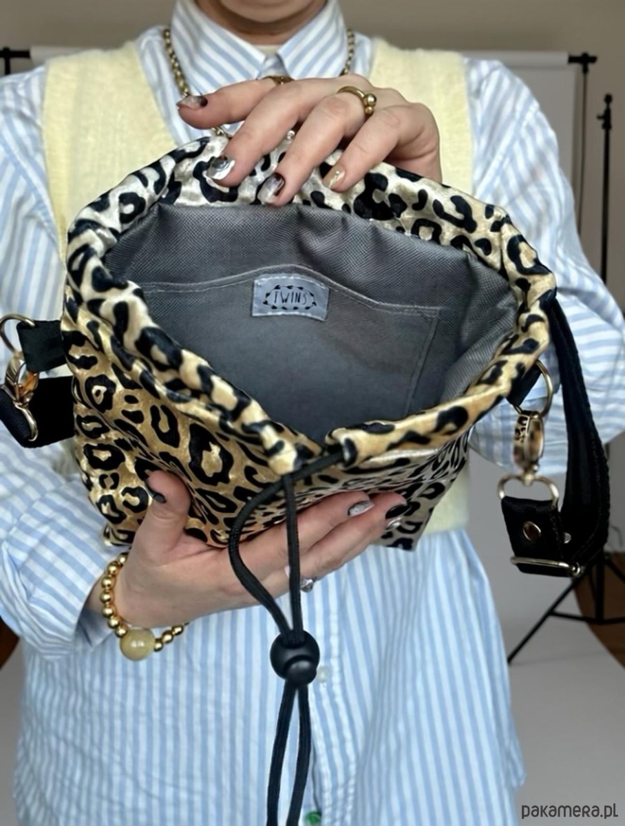 Mała sportowa, torebka Twins alternatywa dla wszechobecnej saszetki. Zaciągana na czarny sznurek. Wykonany z tkaniny z wzorem panterki. W środku podszewka , torebka jest wykonana z tkaniny obiciowej. Rączka to regulowany czarny pasek z do zakładania przez głowę. Torebka jest usztywniana . Wymiary: 30(długość)x30(szerokość)x10(bok); w komplecie regulowana rączka .