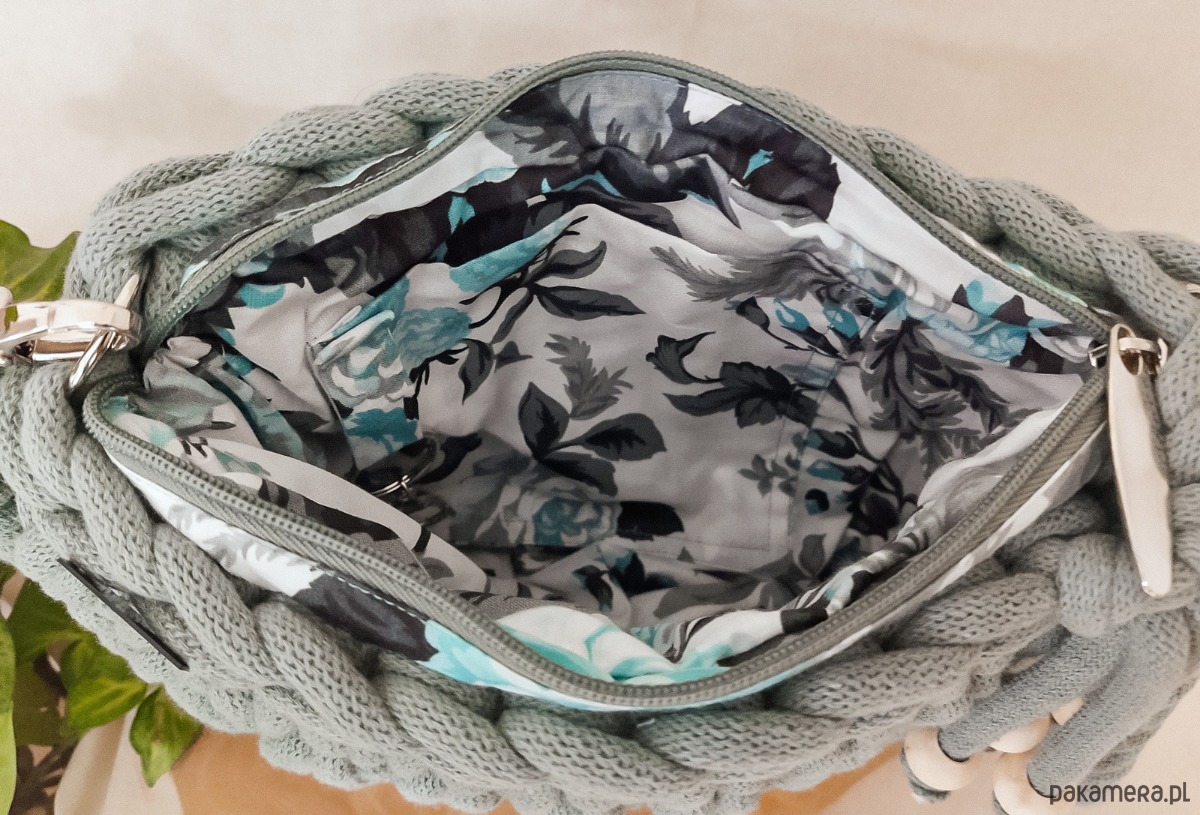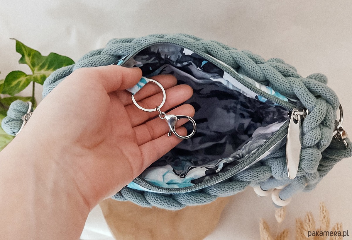 Torebka wykonana jest ręcznie z wysokiej jakości recyklingowego sznurka bawełnianego z certyfikatem STANDARD 100 by OEKO-TEX. Wewnątrz znajduje się dobrana pod kolor sznurka bawełniana, wzorzysta podszewka z kieszonką oraz karabińczykiem do przypięcia kluczy - dzięki temu zawsze będziesz wiedzieć gdzie są i obejdzie się bez zbędnego szukania.