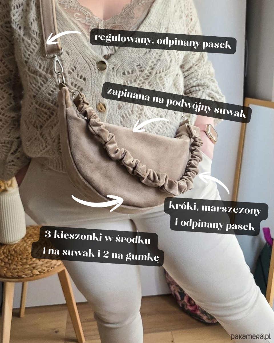● dodatkowo torebka posiada krótki, odpinany, marszczony pasek