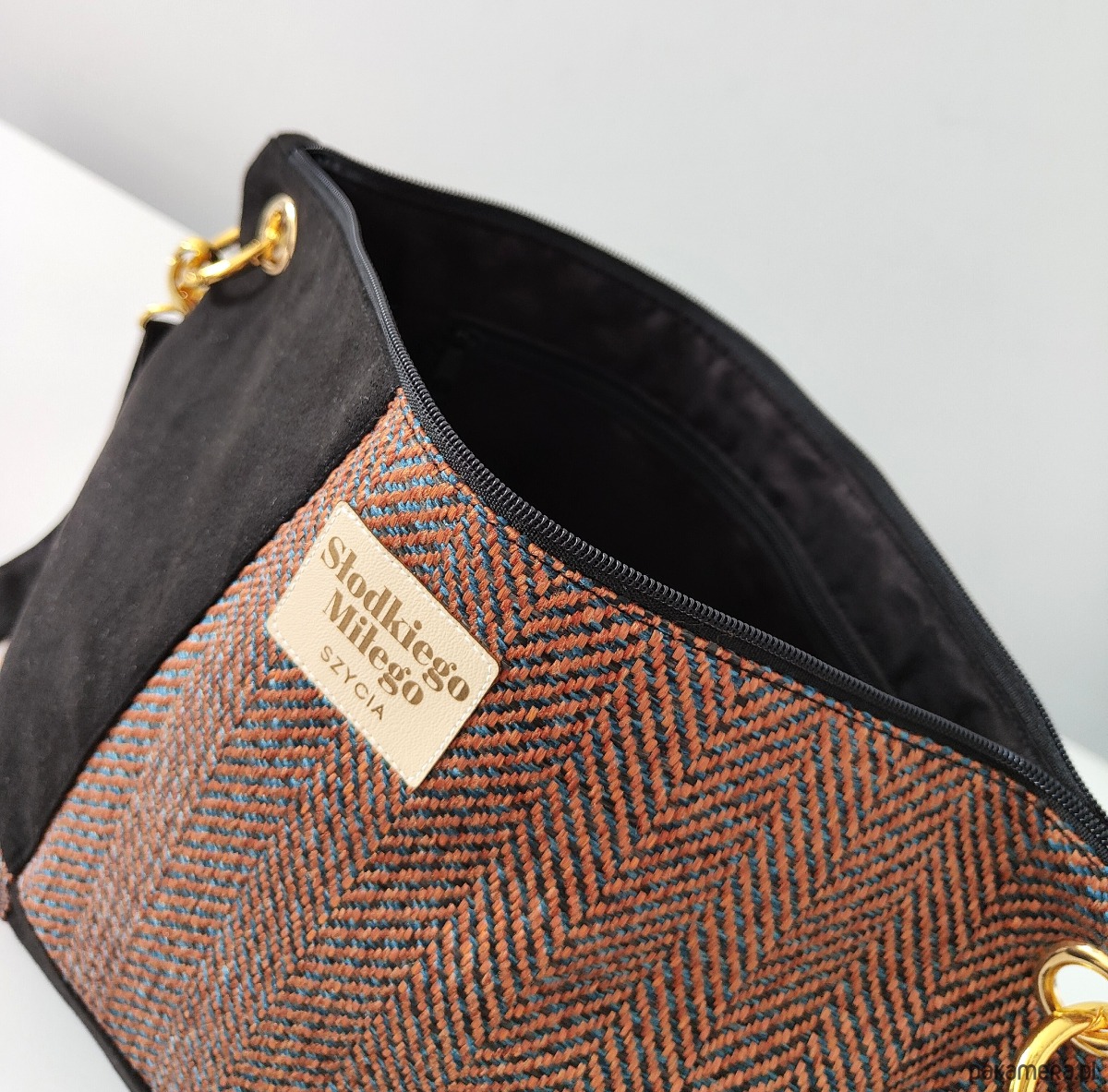 Wewnątrz bawełniana podszewka i mała kieszonka zapinana na ekspres.