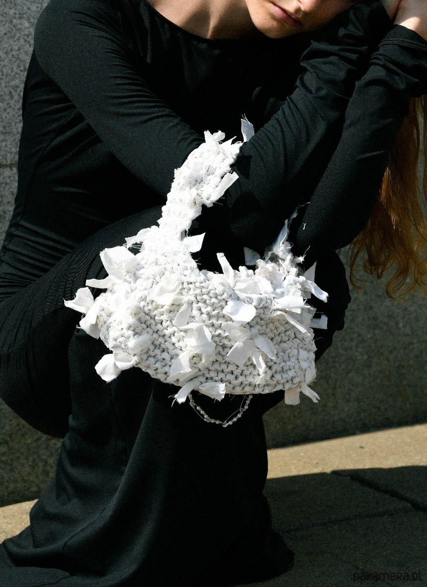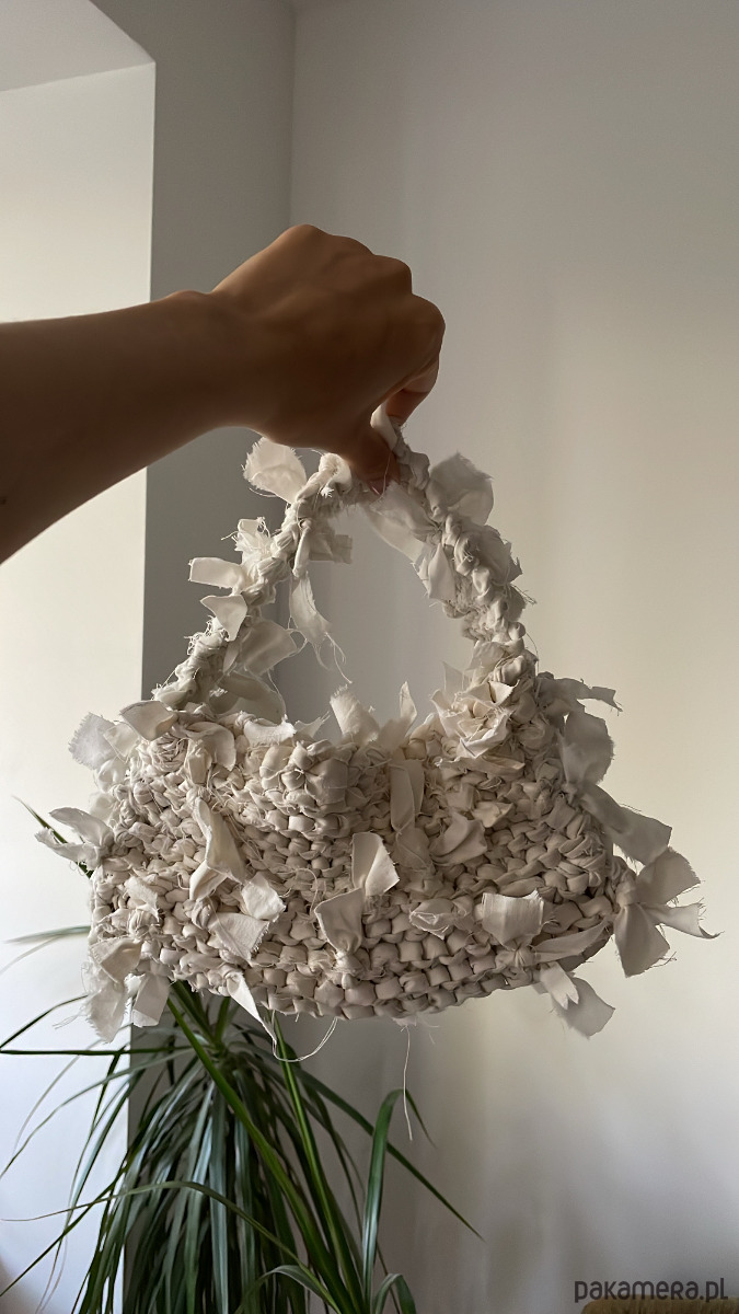 Wyjątkowa, ręcznie robiona na szydełku torebka na ramię z poddanych recyklingowi skrawków tkanin.
