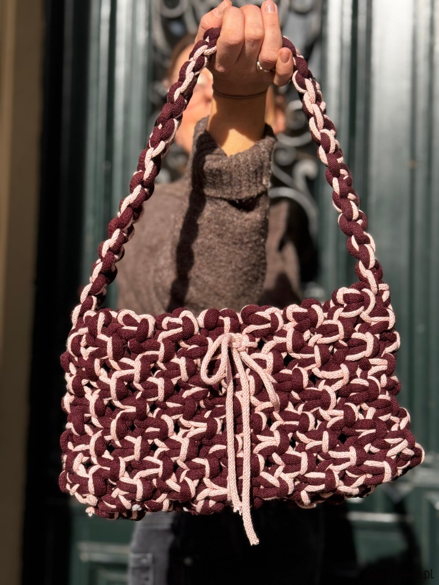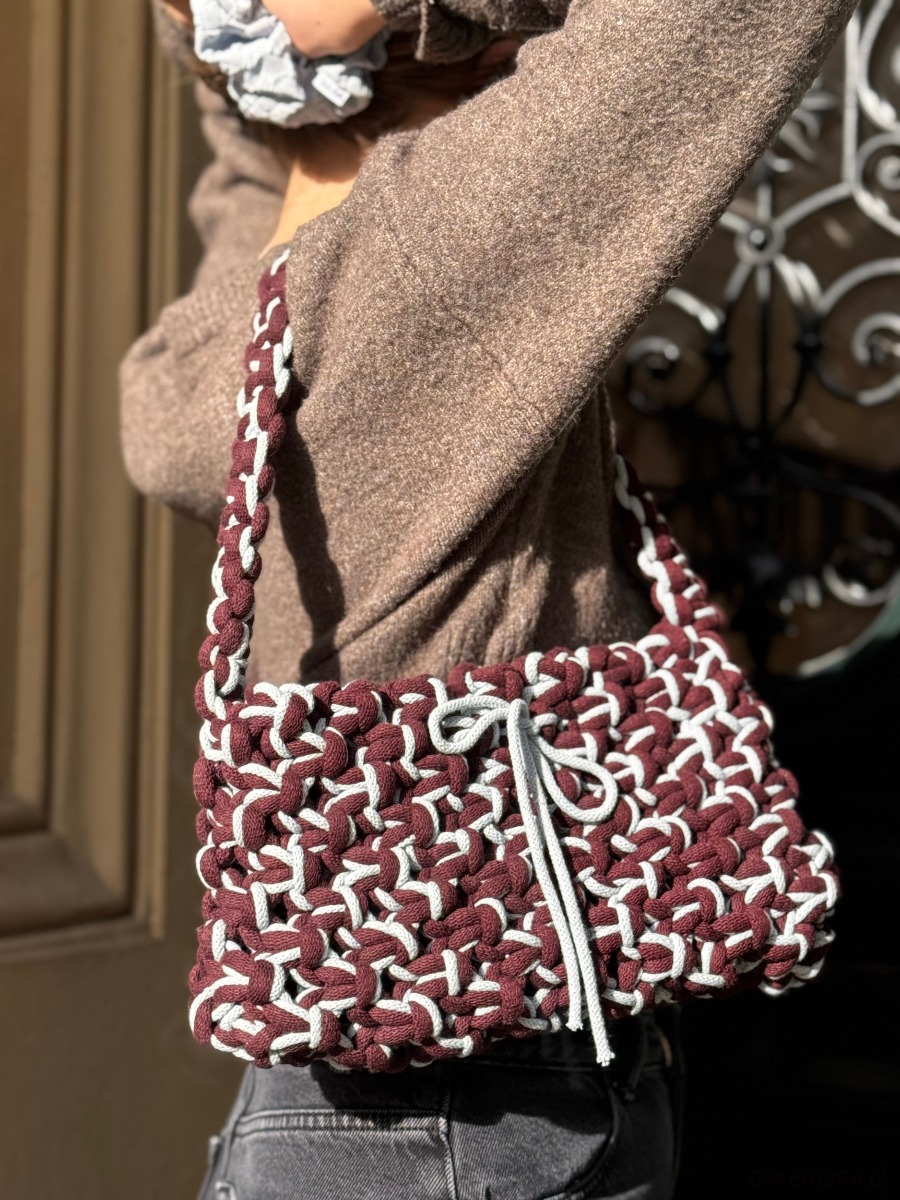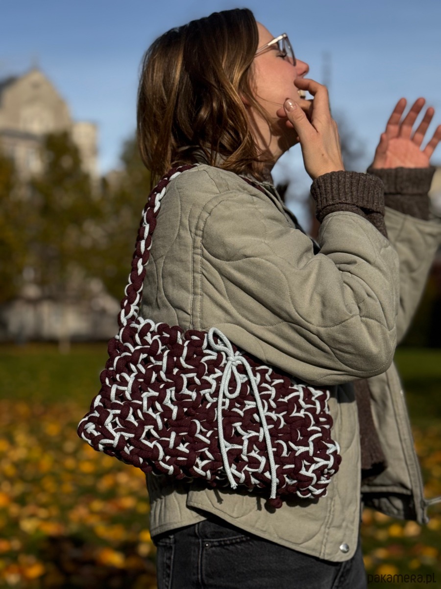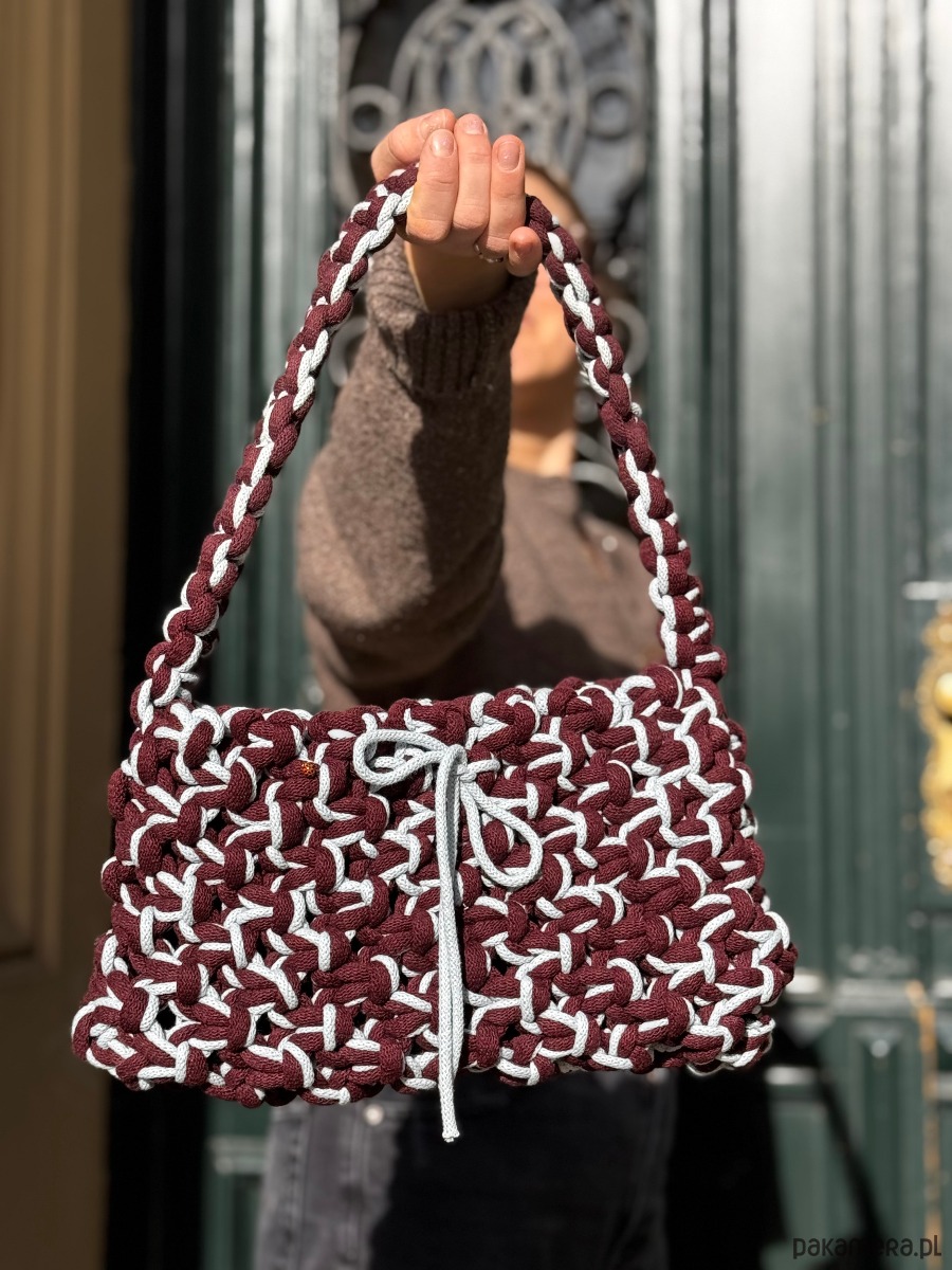To torebka, która łączy w sobie wyrazistość grubego splotu i delikatność detali, uroczą kokardkę i połączenie dwóch rodzajów sznurka.