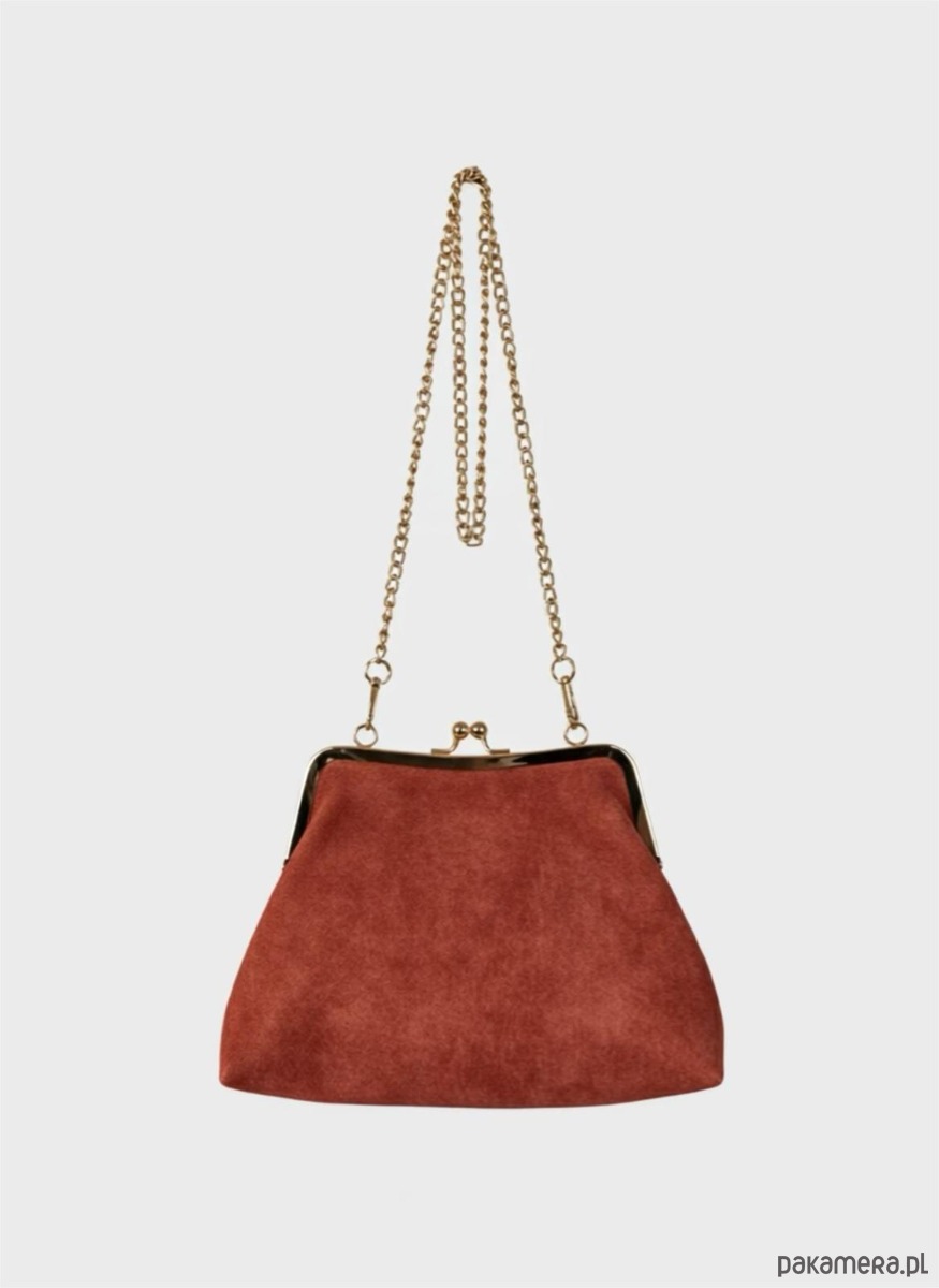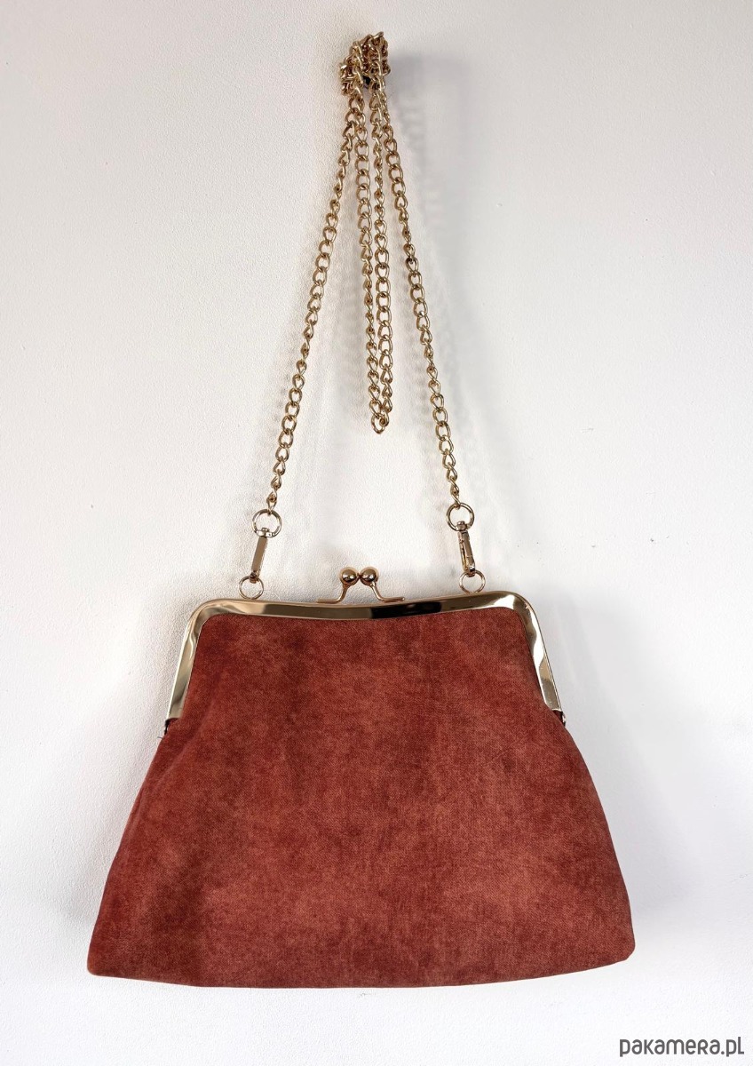 Mała, elegancka torebka zapinana na metalowe, zapięcie koloru złotego. Wykonana z brązowej tkaniny. kolor wpada w rudy. W środku podszewka, torebka jest wykonana z tkaniny obiciowej.
