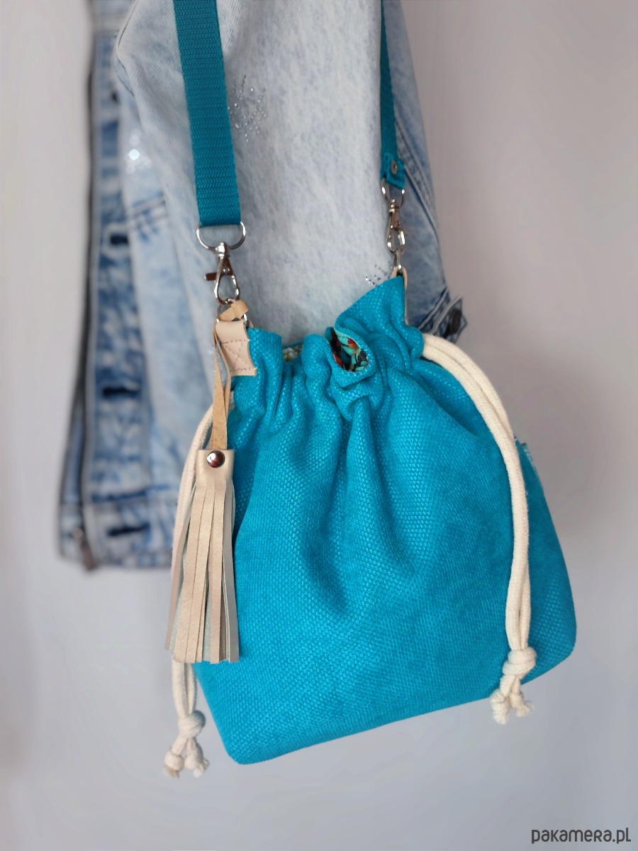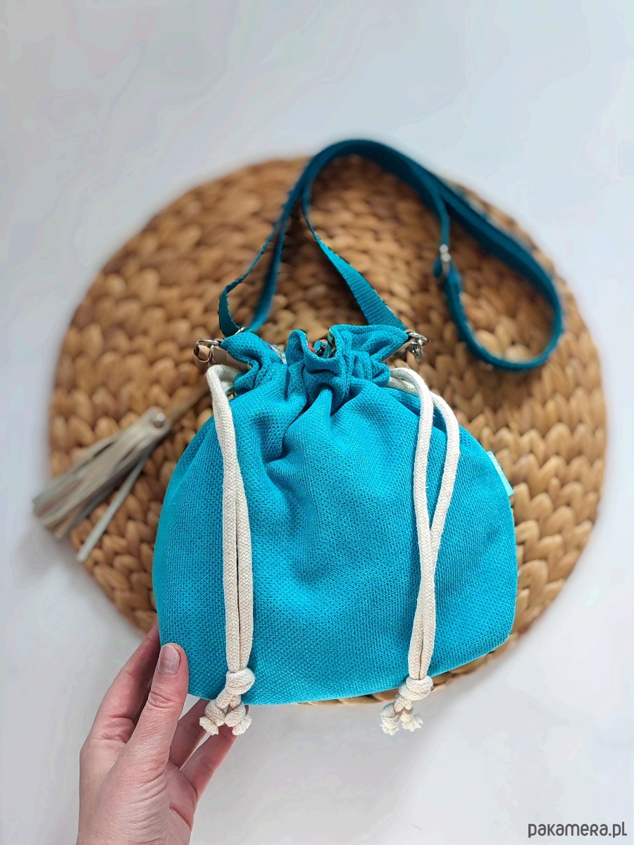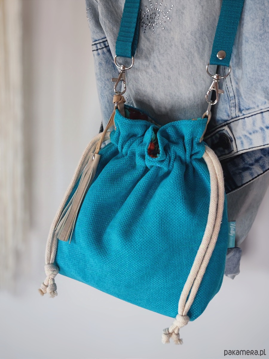 Sakiewka to oryginalny i wygodny fason, pasujący do wielu stylizacji. Torebka została stworzona w pojedynczym egzemplarzu, w żywych odcieniach niebieskiego, turkusu i morskiego. Uszyta z tkaniny tapicerskiej z fakturą. W środku bawełniana podszewka i dwie otwarte kieszonki.