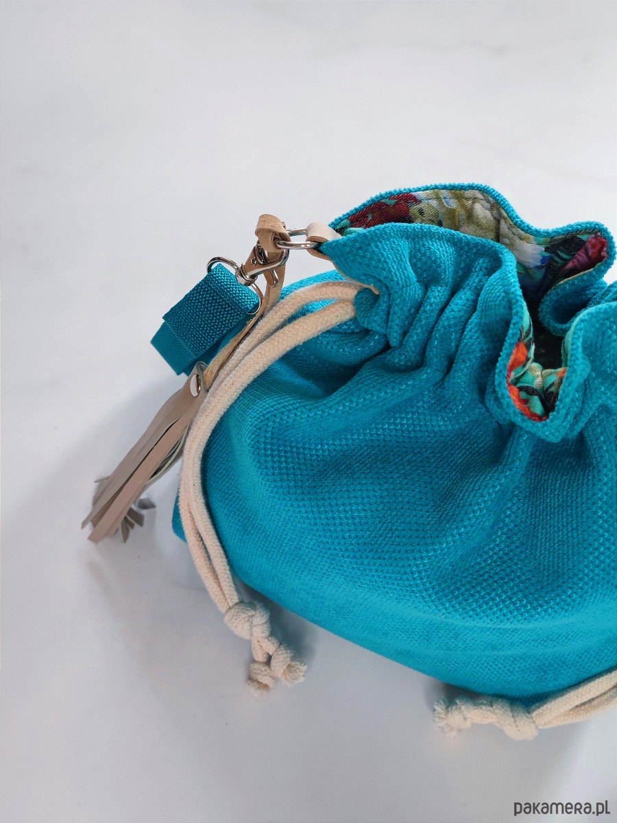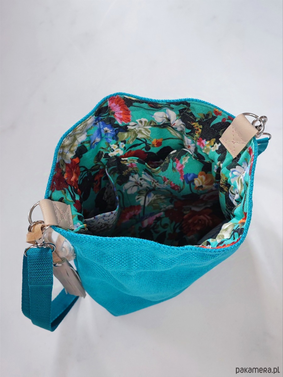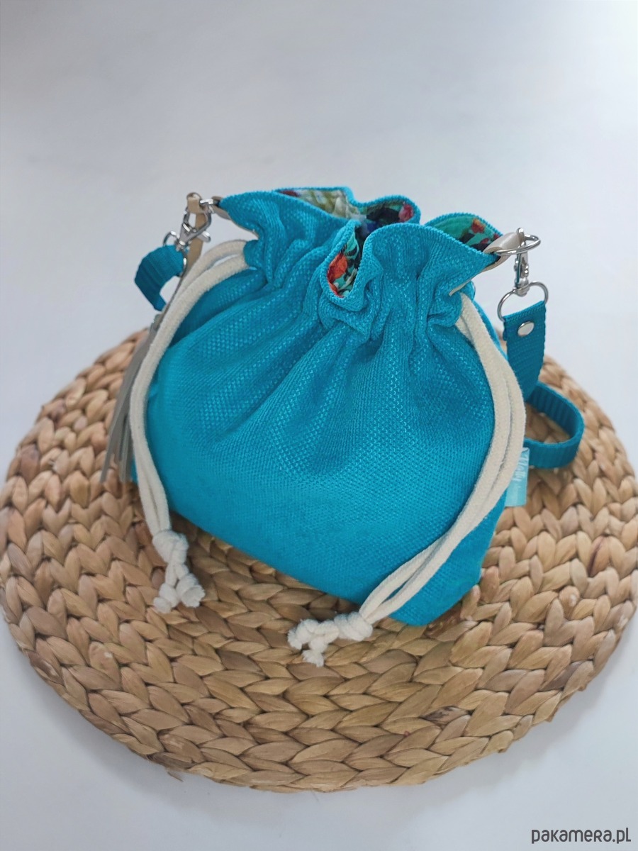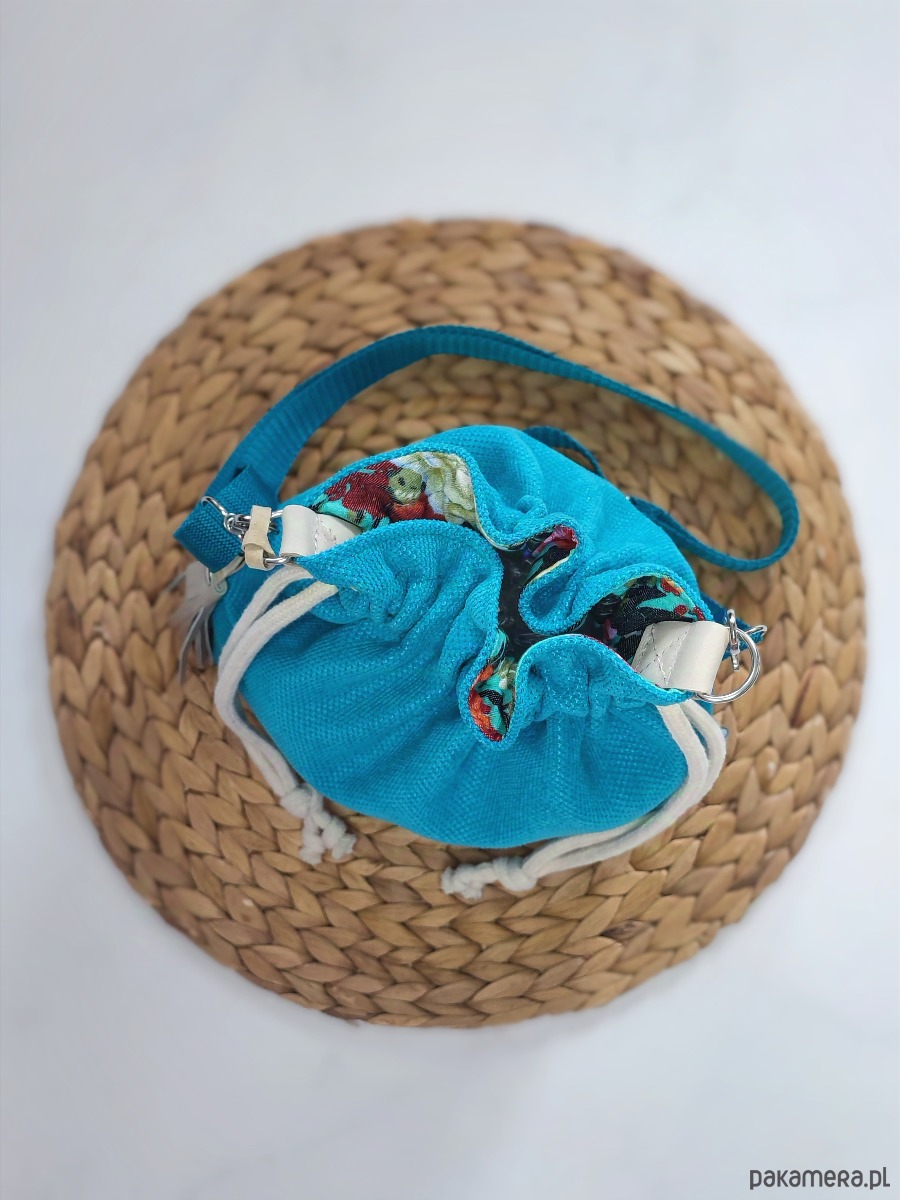 Sakiewka to oryginalny i wygodny fason, pasujący do wielu stylizacji. Torebka została stworzona w pojedynczym egzemplarzu, w żywych odcieniach niebieskiego, turkusu i morskiego. Uszyta z tkaniny tapicerskiej z fakturą. W środku bawełniana podszewka i dwie otwarte kieszonki.