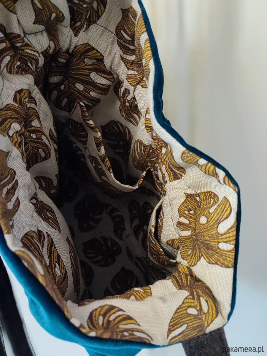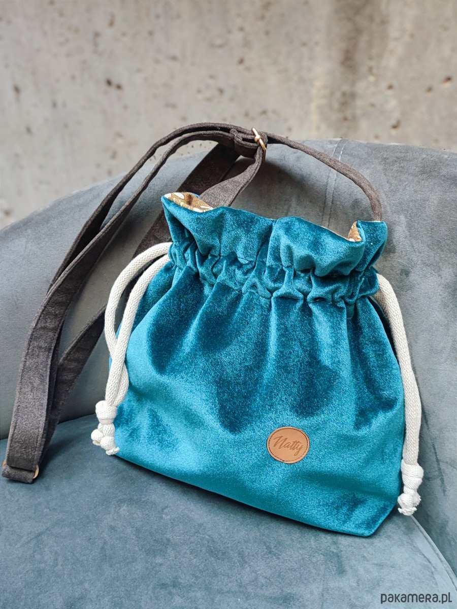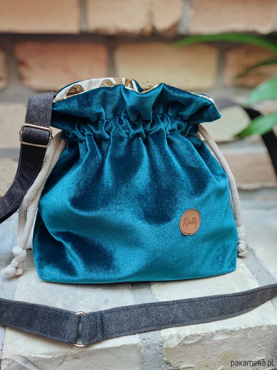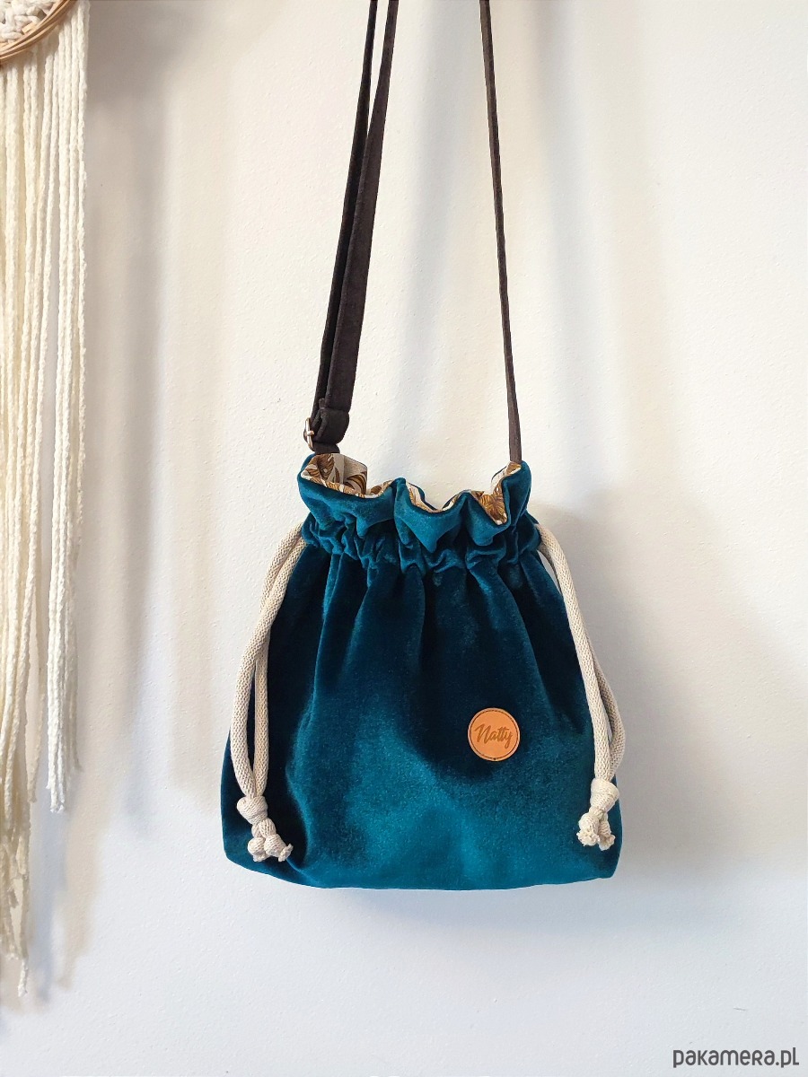 Torebka sakiewka stworzona w pojedynczym egzemplarzu, w pięknym ciemno morskim kolorze. Uszyta z połyskującego weluru. W środku podszewka z bawełny i dwie otwarte kieszonki.