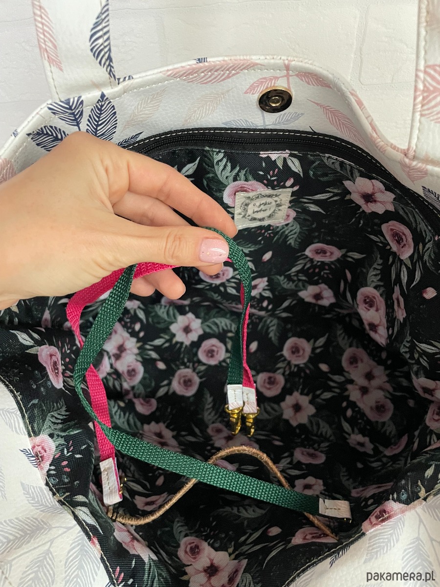 W środku kieszeń na zamek, kieszeń otwarta i dwie smycze na klucze w kolorach zielonym i różowym- nie będziesz musiała grzebać w środku i szukać! ;)