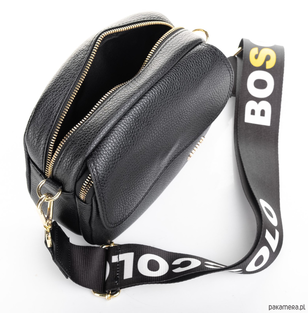 dodatkowo dopinany szeroki na 5 cm pasek tekstylny z logo, skórzane końcówki w kolorze torebki, regulowany, max 135 cm