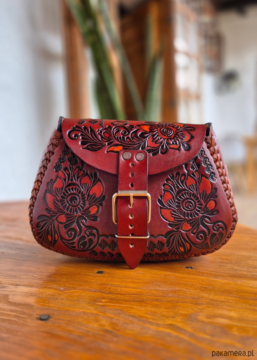 Skóra użyta to wykonania torebki jest ręcznie garbowana, wzory wykonane są za pomocą odpowiedniego ręcznego stempla, a następnie malowane.