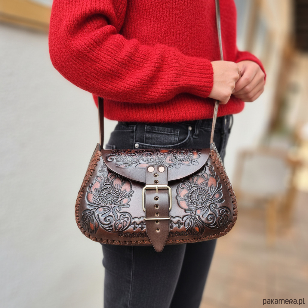 Torebka Folklora to unikatowy dodatek, który łączy w sobie tradycję rzemiosła i nowoczesny design. Wykonana ręcznie z grubej skóry naturalnej, charakteryzuje się wyjątkową trwałością i elegancją. Jej powierzchnię zdobią misterne wzory w kształcie kwiatów, które nadają torebce artystycznego wyrazu i nawiązują do folklorystycznych motywów. Dzięki dużej przestrzeni w środku Folklora jest idealna na co dzień, łącząc funkcjonalność z niepowtarzalnym stylem. Każdy egzemplarz jest jedyny w swoim rodzaju, co czyni ją idealnym wyborem dla osób ceniących oryginalność i rękodzieło.